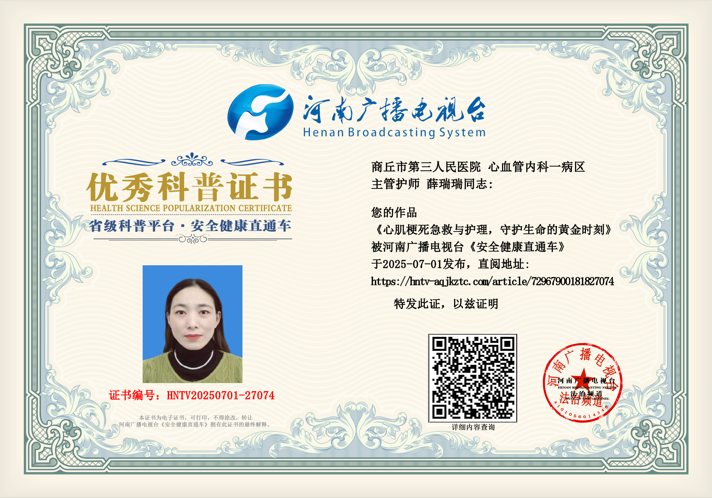 (薛瑞瑞 商丘市第三人民医院 心血管内科一病区 主管护师)