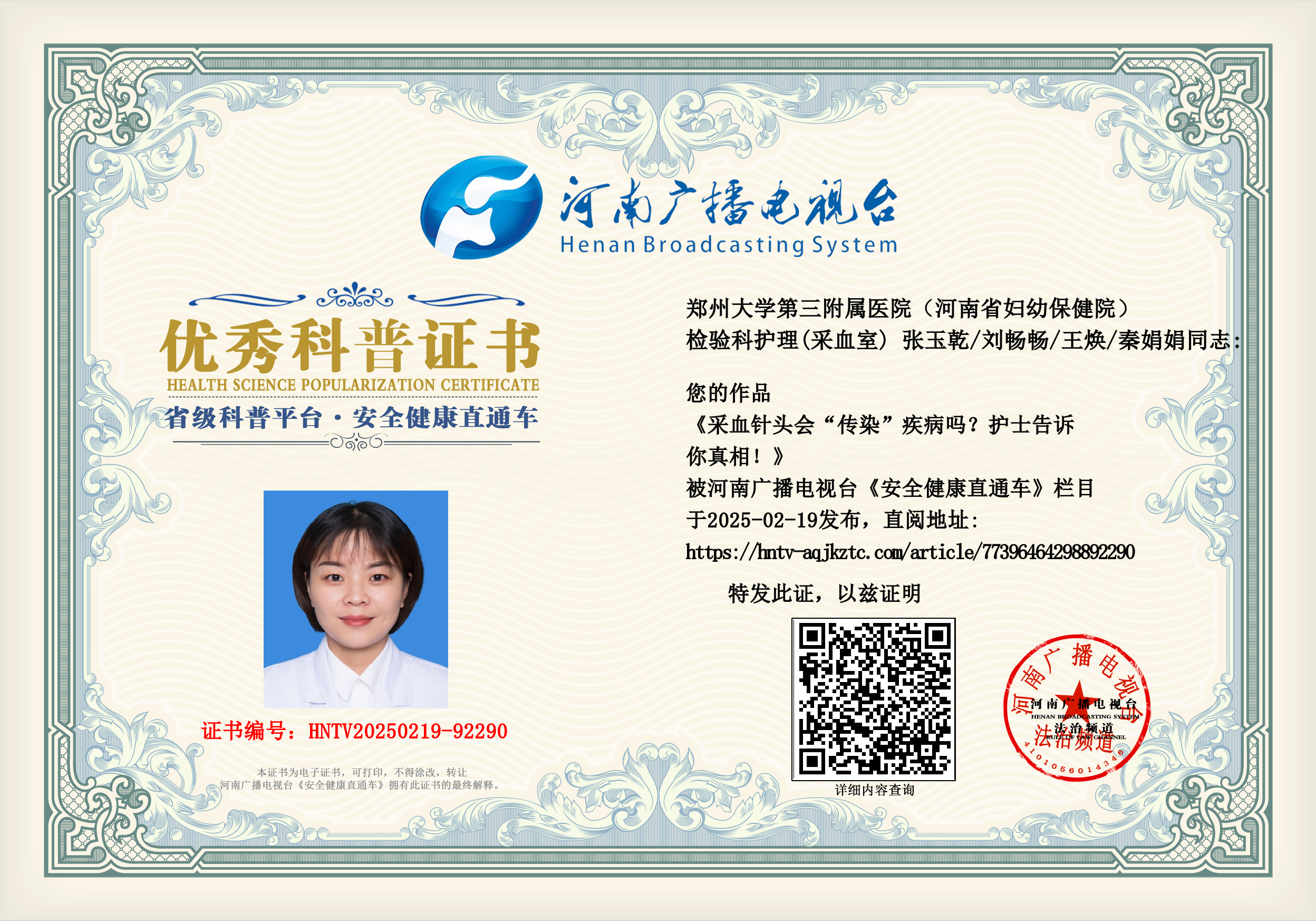 (张玉乾/刘畅畅/王焕/秦娟娟 郑州大学第三附属医院(河南省妇幼保健院) 检验科护理(采血室) 检验科主管护师)