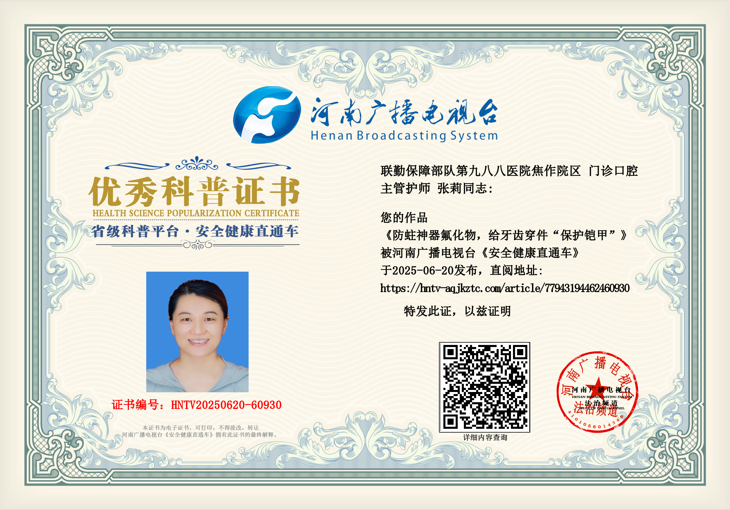 (张莉 联勤保障部队第九八八医院焦作院区 门诊口腔 主管护师)