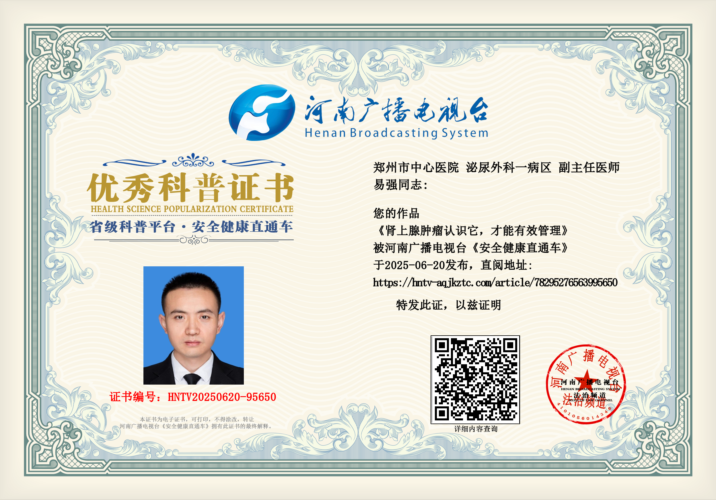 (易强 郑州市中心医院 泌尿外科一病区 副主任医师)