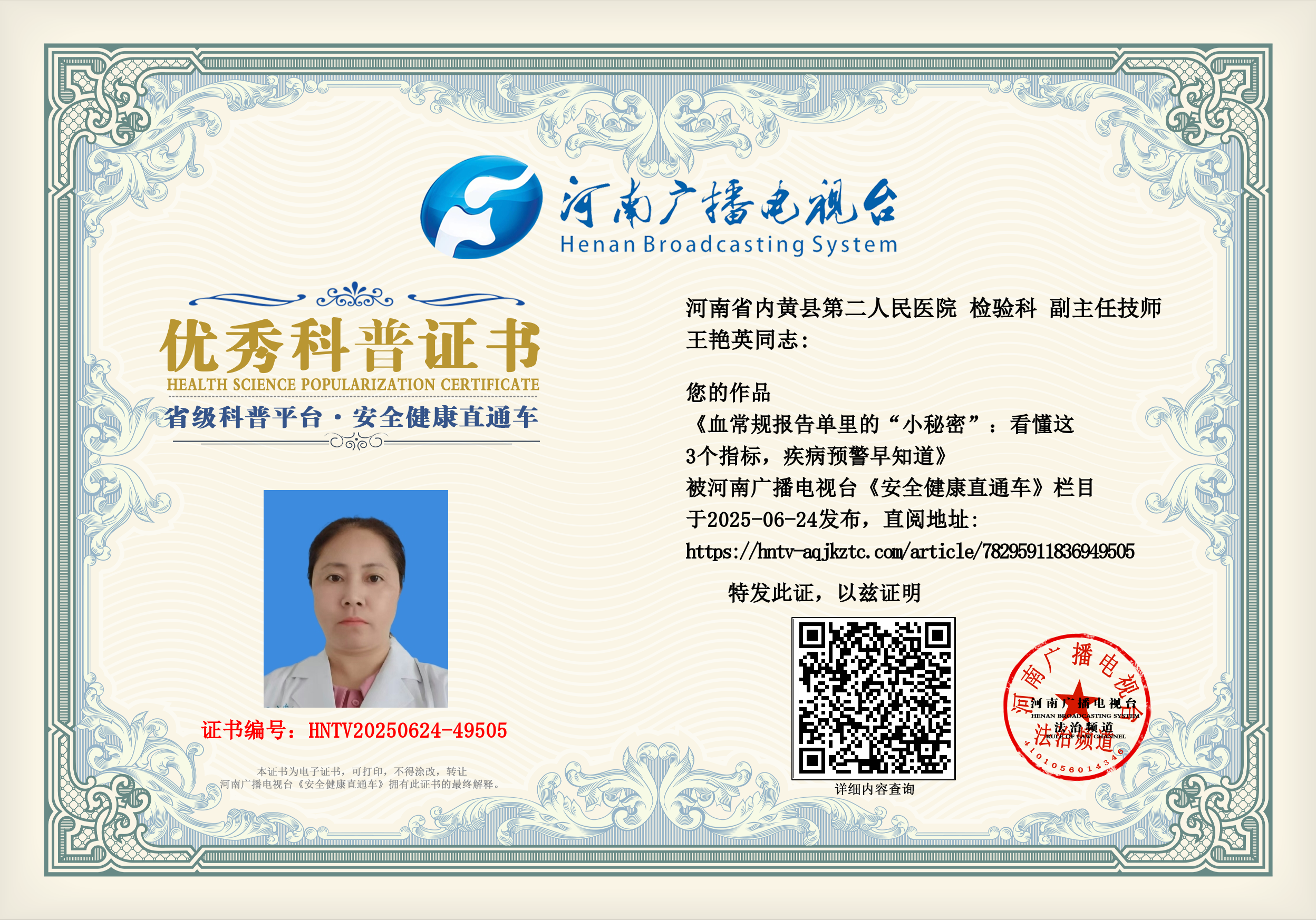 (王艳英 河南省内黄县第二人民医院 检验科 副主任技师)