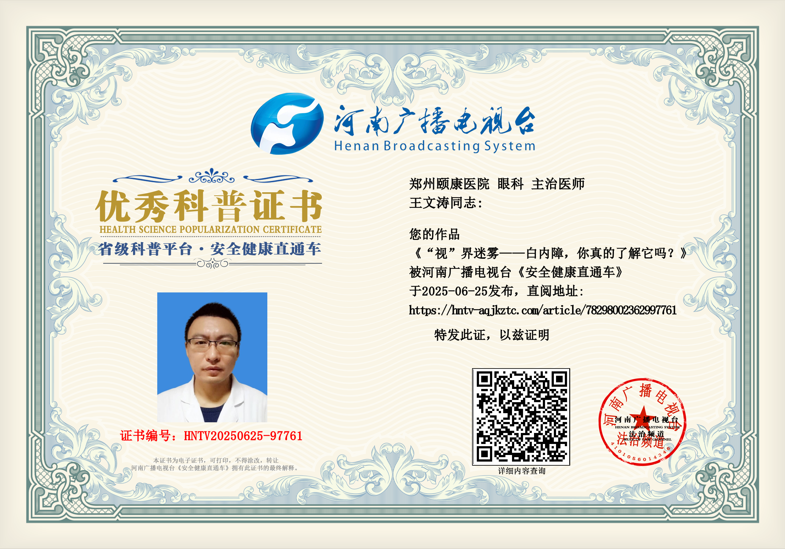 (王文涛 郑州颐康医院 眼科 主治医师)