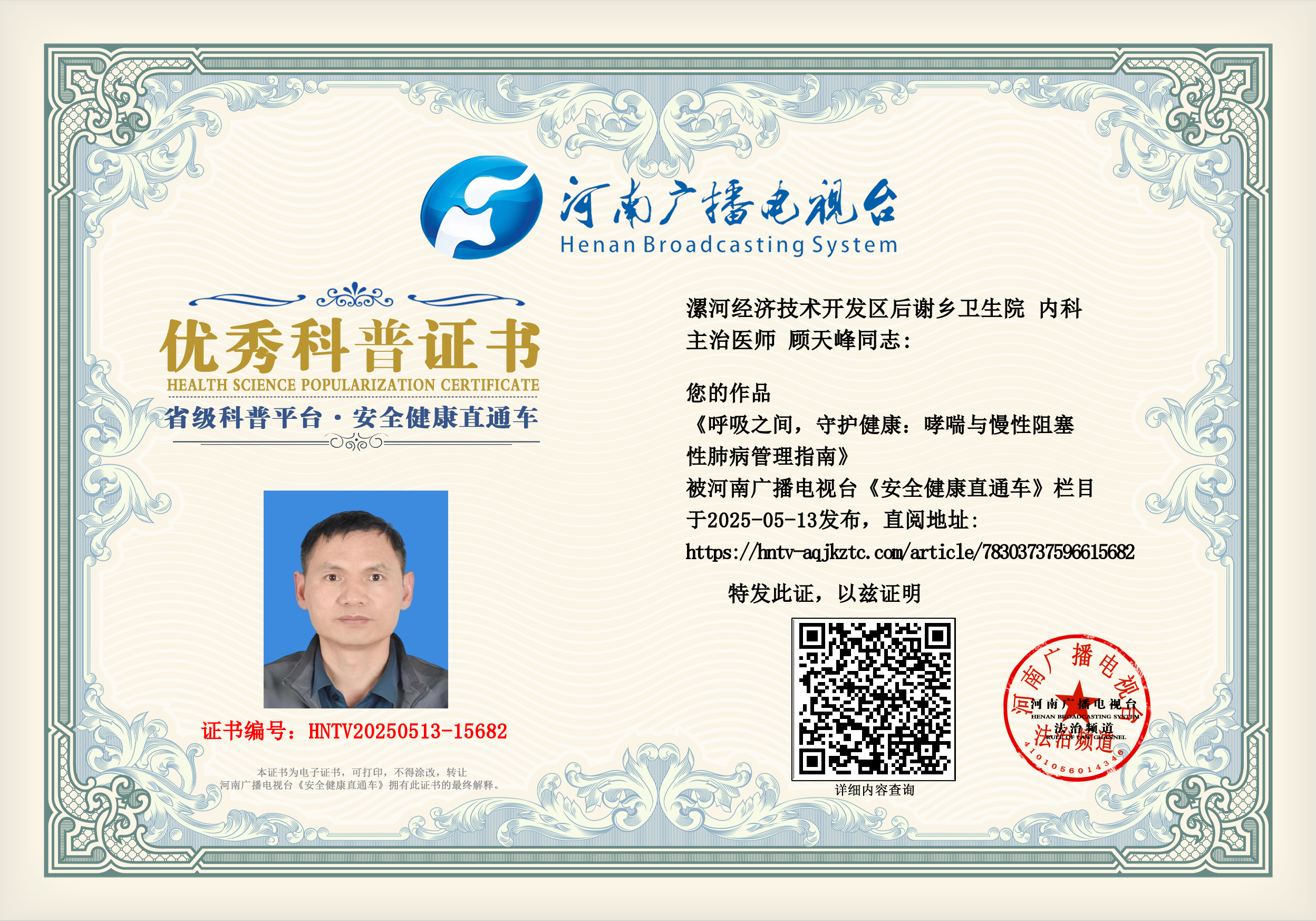 (顾天峰 漯河经济技术开发区后谢乡卫生院 内科 主治医师)
