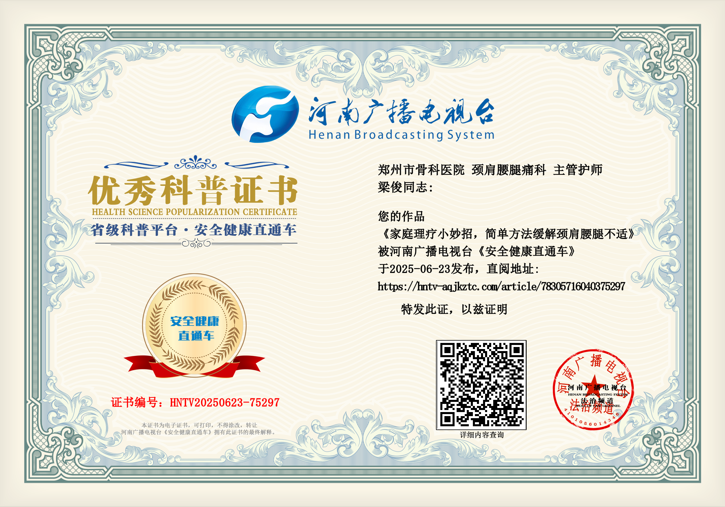 (梁俊 郑州市骨科医院 颈肩腰腿痛科 主管护师)