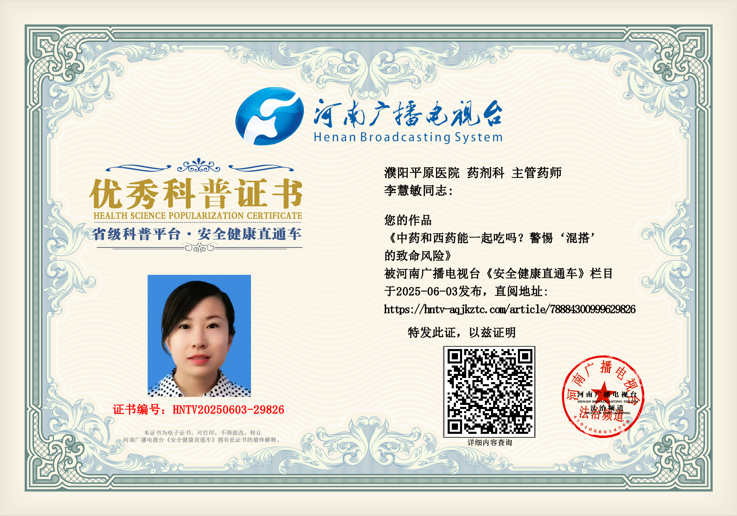 (李慧敏 濮阳平原医院 药剂科 主管药师)