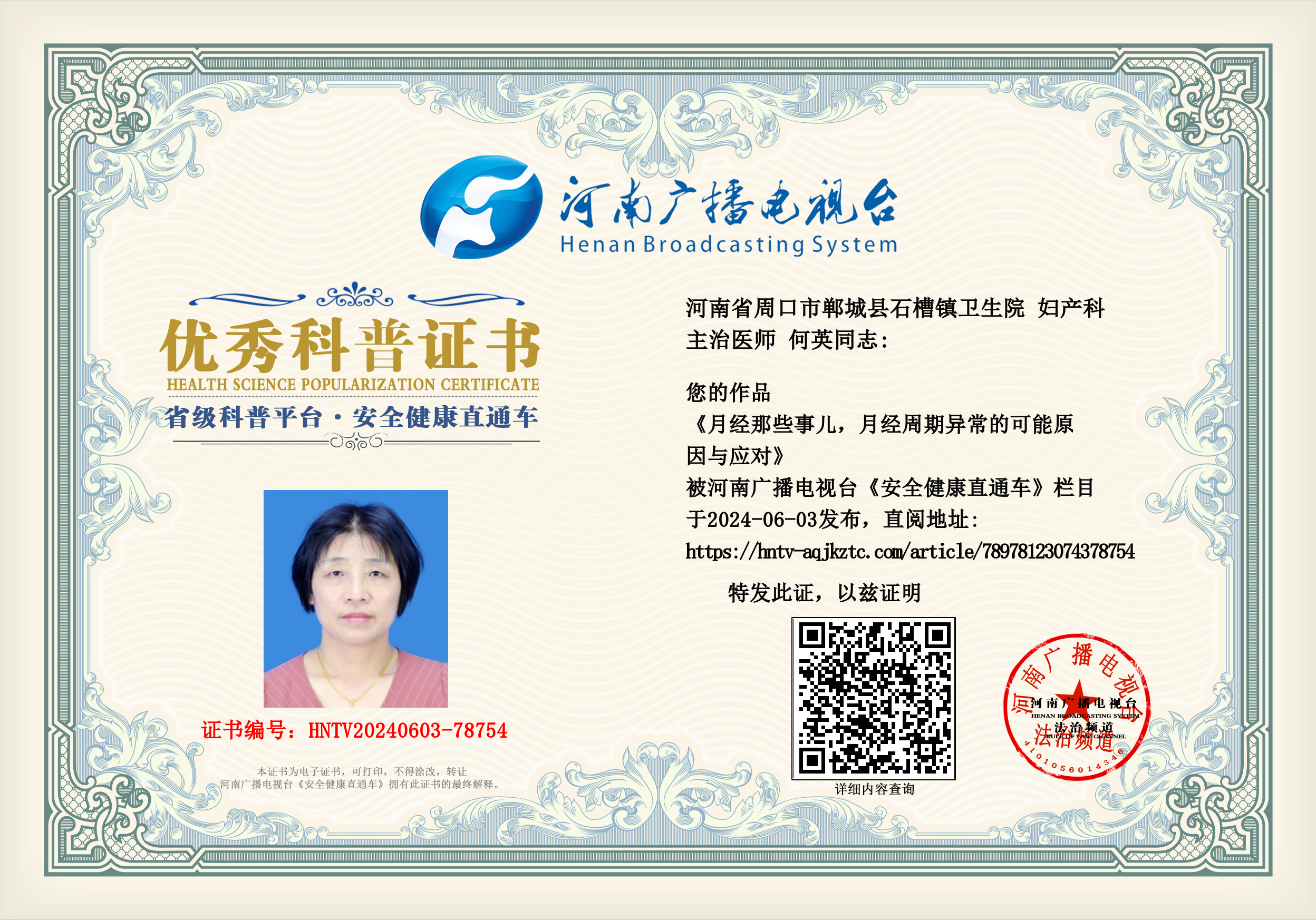 (何英 河南省周口市郸城县石槽镇卫生院 妇产科 主治医师)