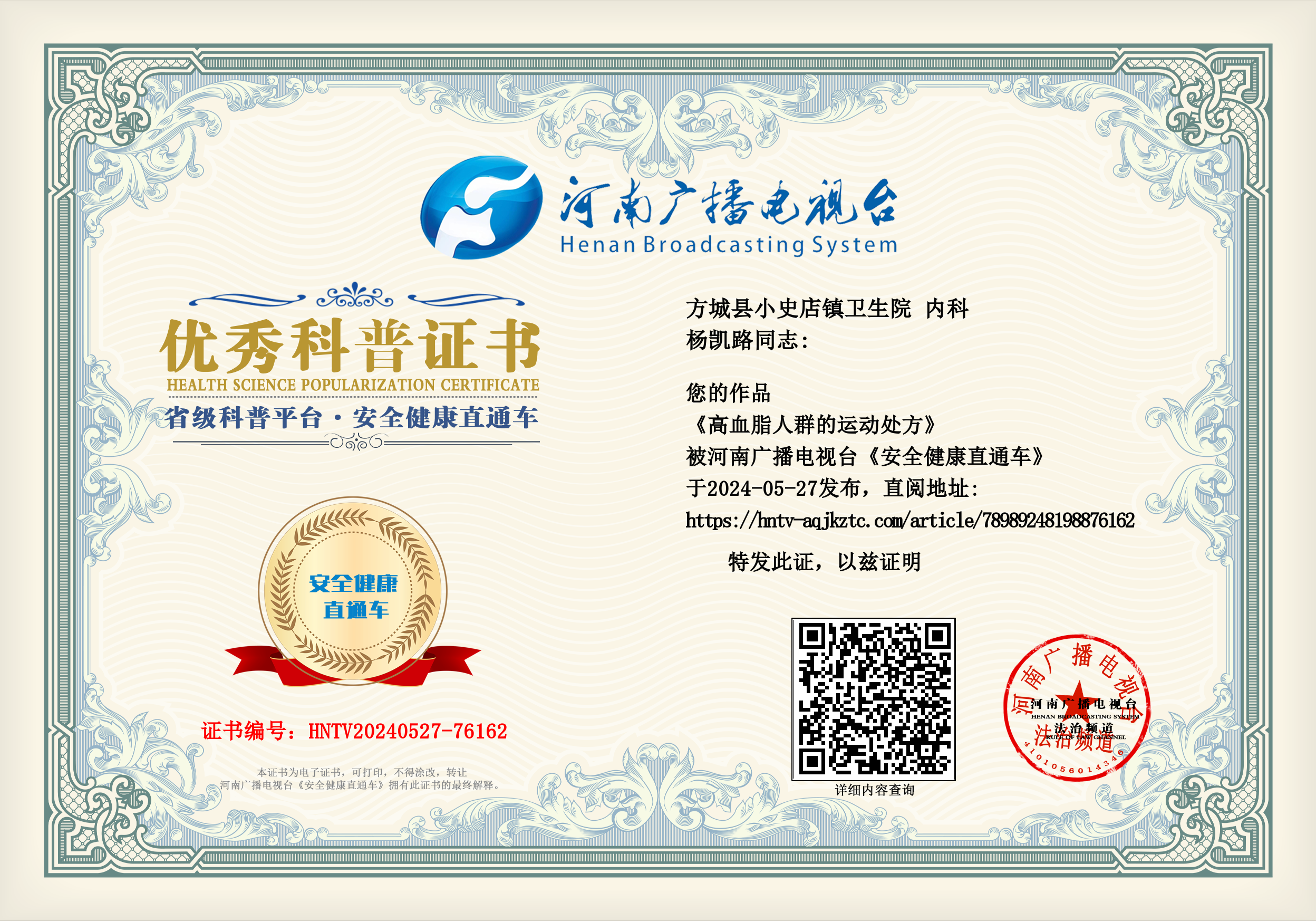 (杨凯路 方城县小史店镇卫生院 内科)