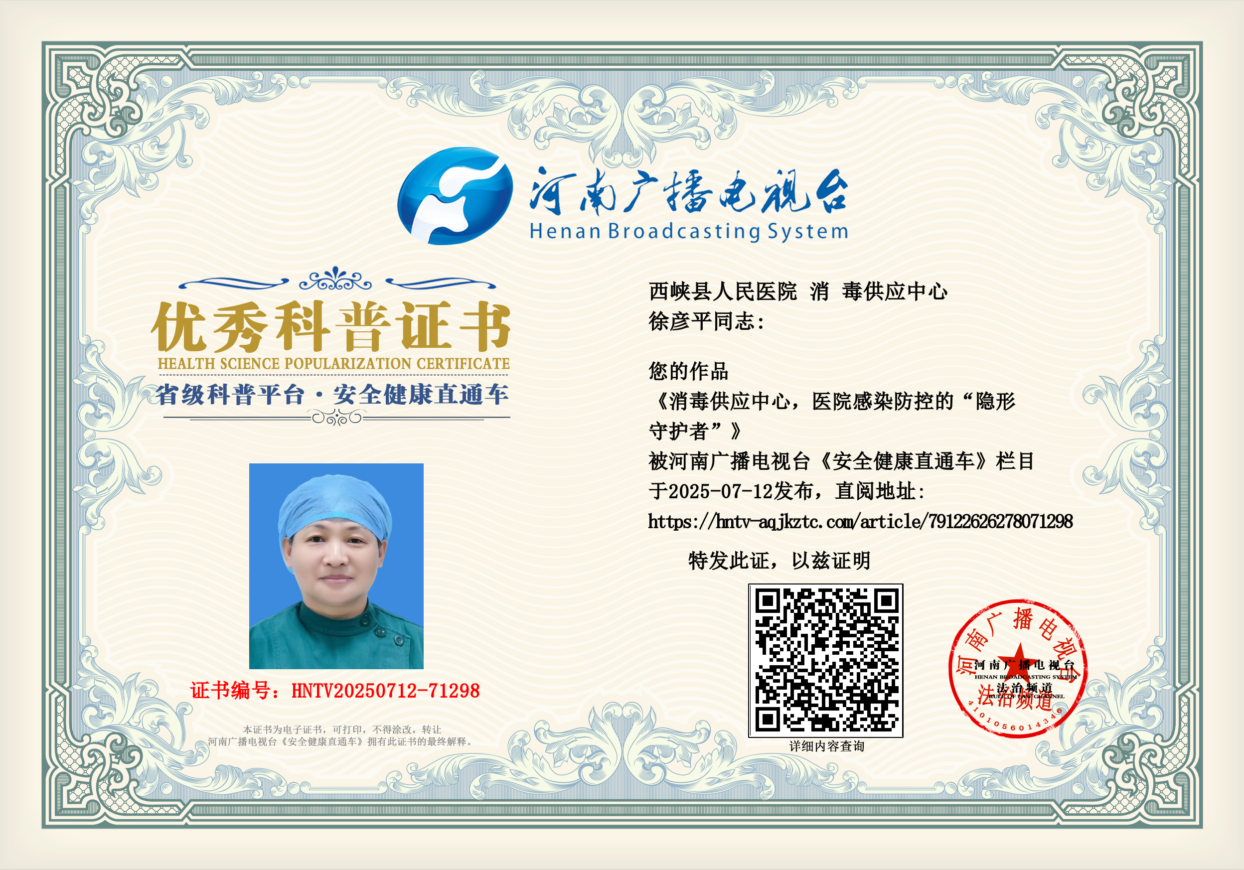 (徐彦平 西峡县人民医院 消 毒供应中心)