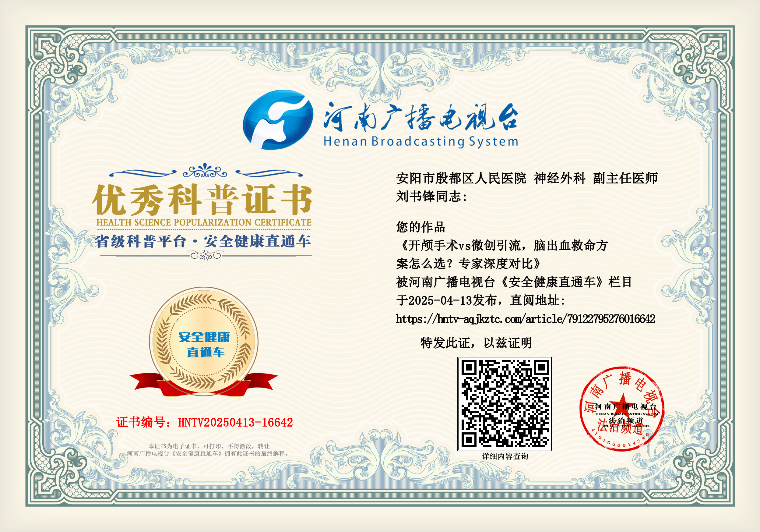 (刘书锋 安阳市殷都区人民医院 神经外科 副主任医师)