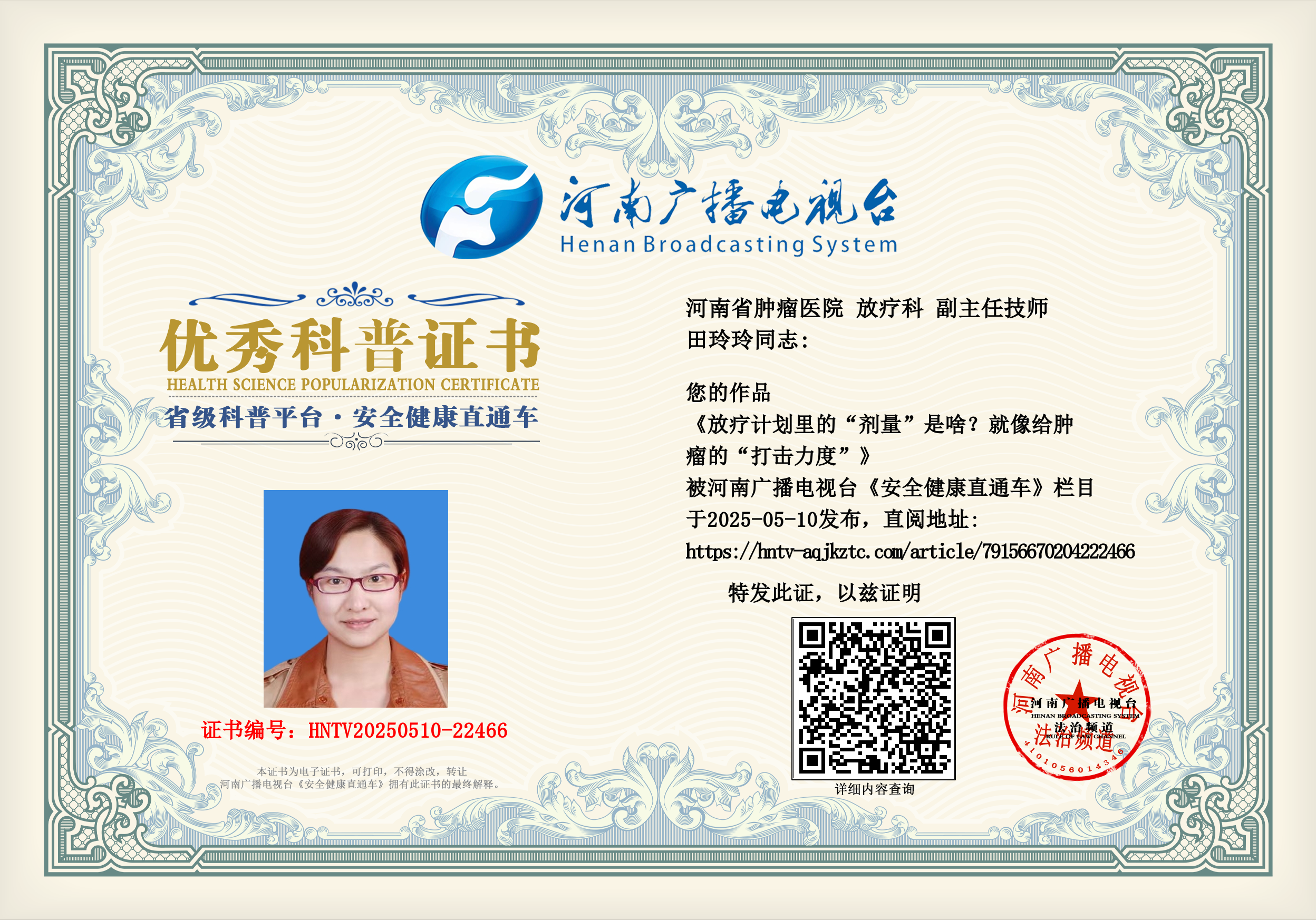 (田玲玲 河南省肿瘤医院 放疗科 副主任技师)