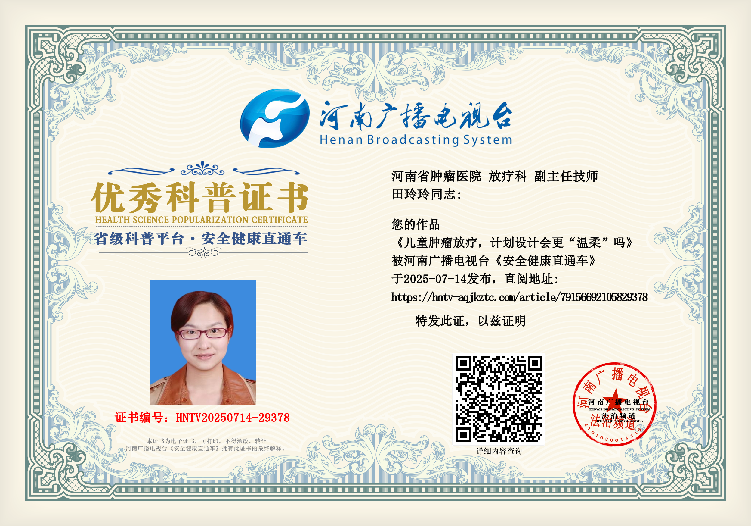 (田玲玲 河南省肿瘤医院 放疗科 副主任技师)