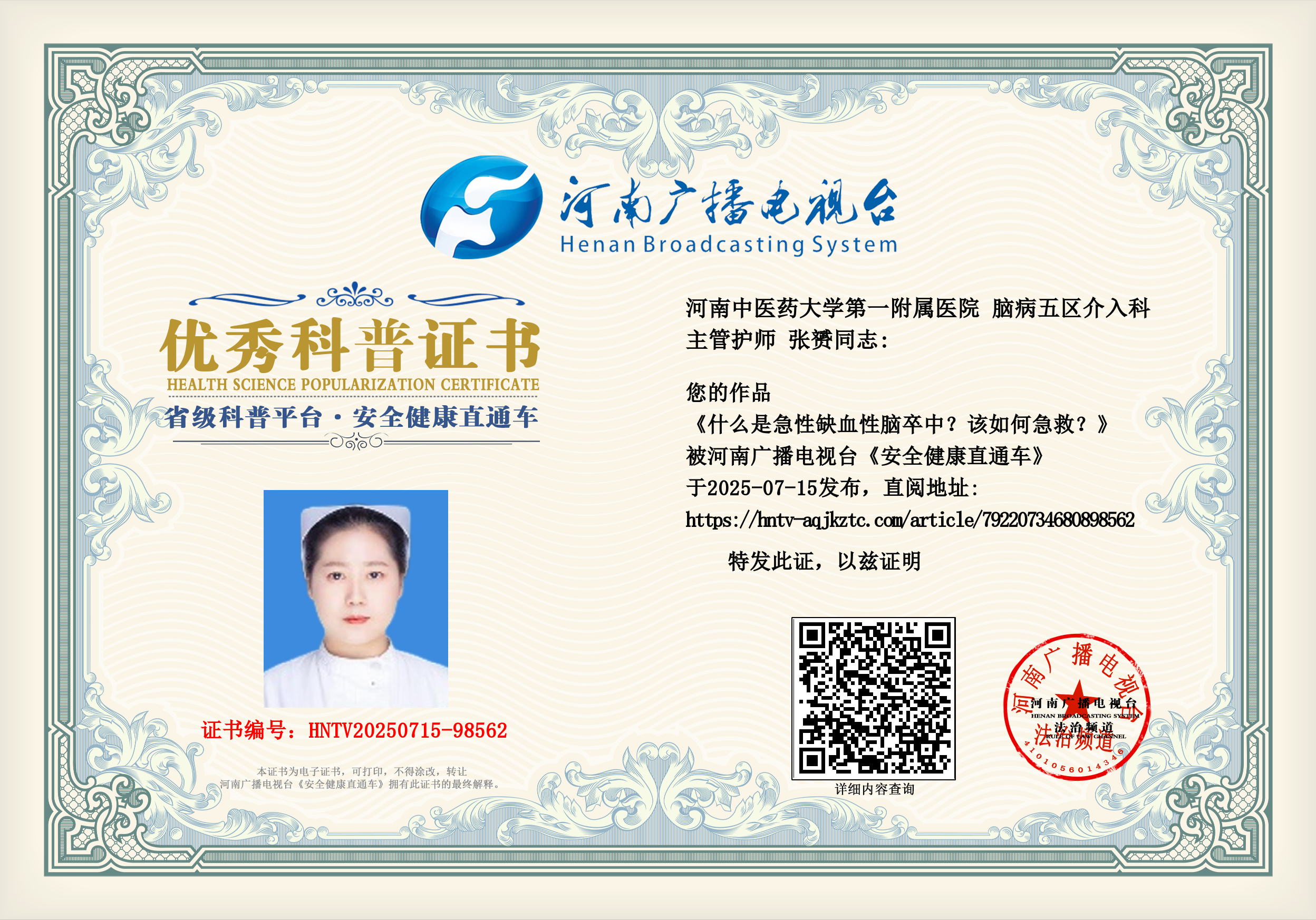 (张赟 河南中医药大学第一附属医院 脑病五区介入科 主管护师)