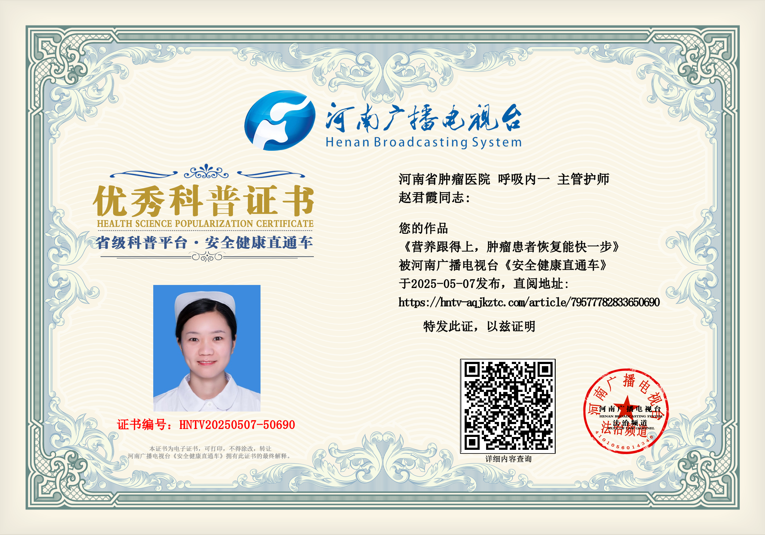 (赵君霞 河南省肿瘤医院 呼吸内一 主管护师)