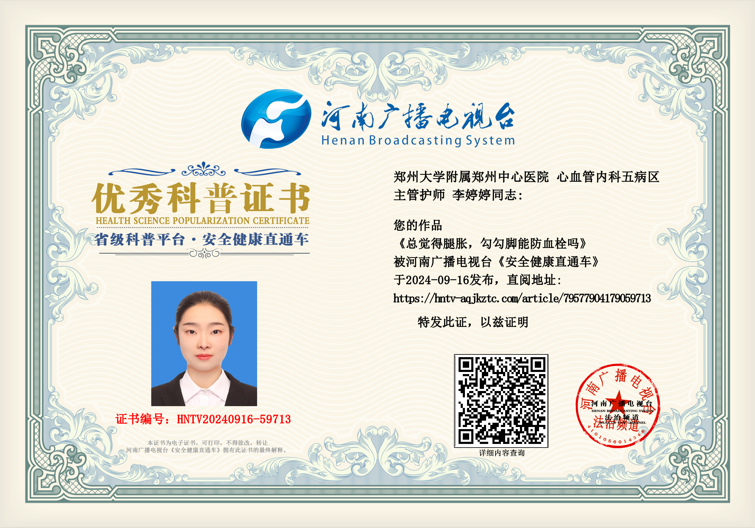 (李婷婷 郑州大学附属郑州中心医院 心血管内科五病区 主管护师)