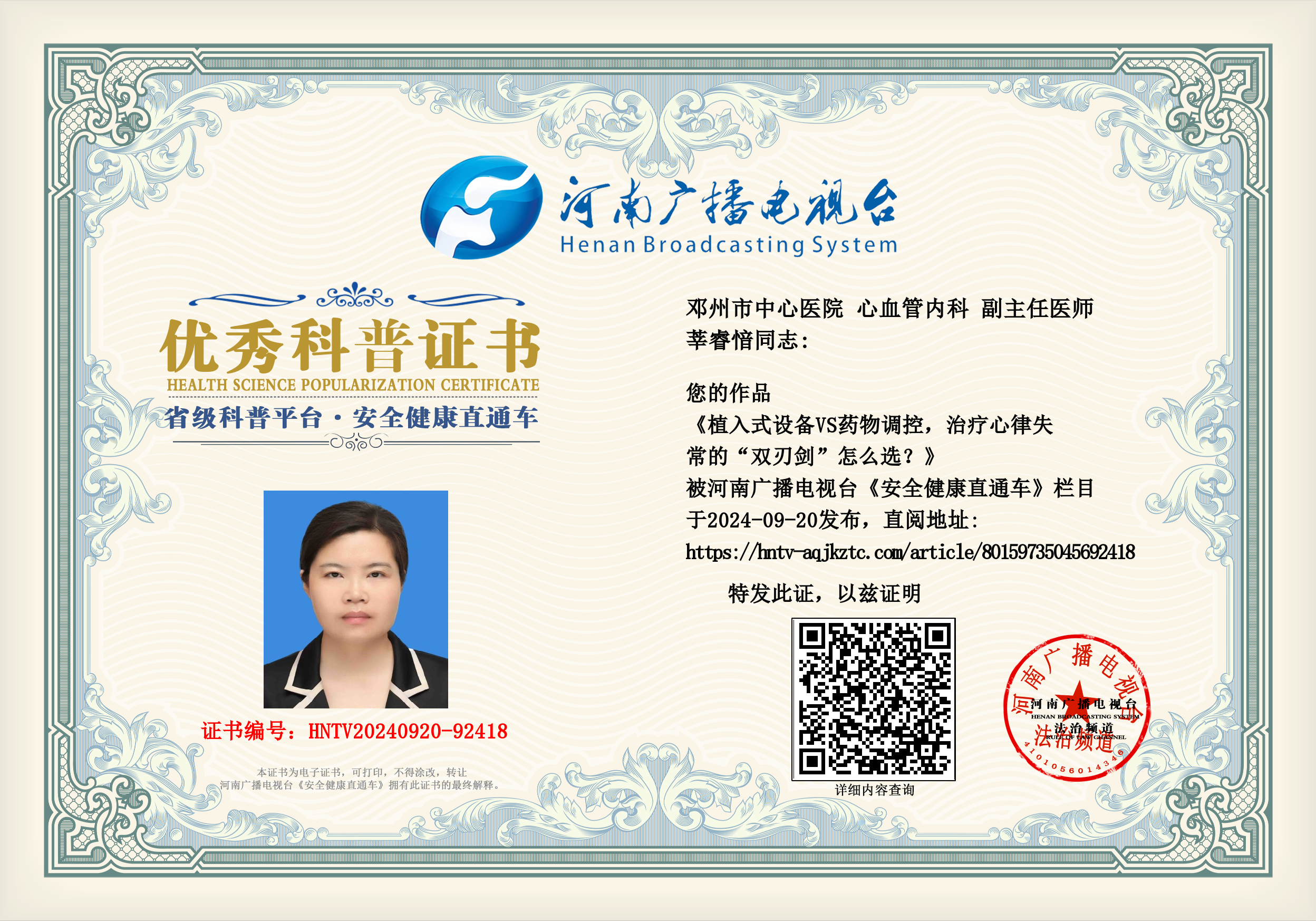(莘睿愔 邓州市中心医院 心血管内科 副主任医师)