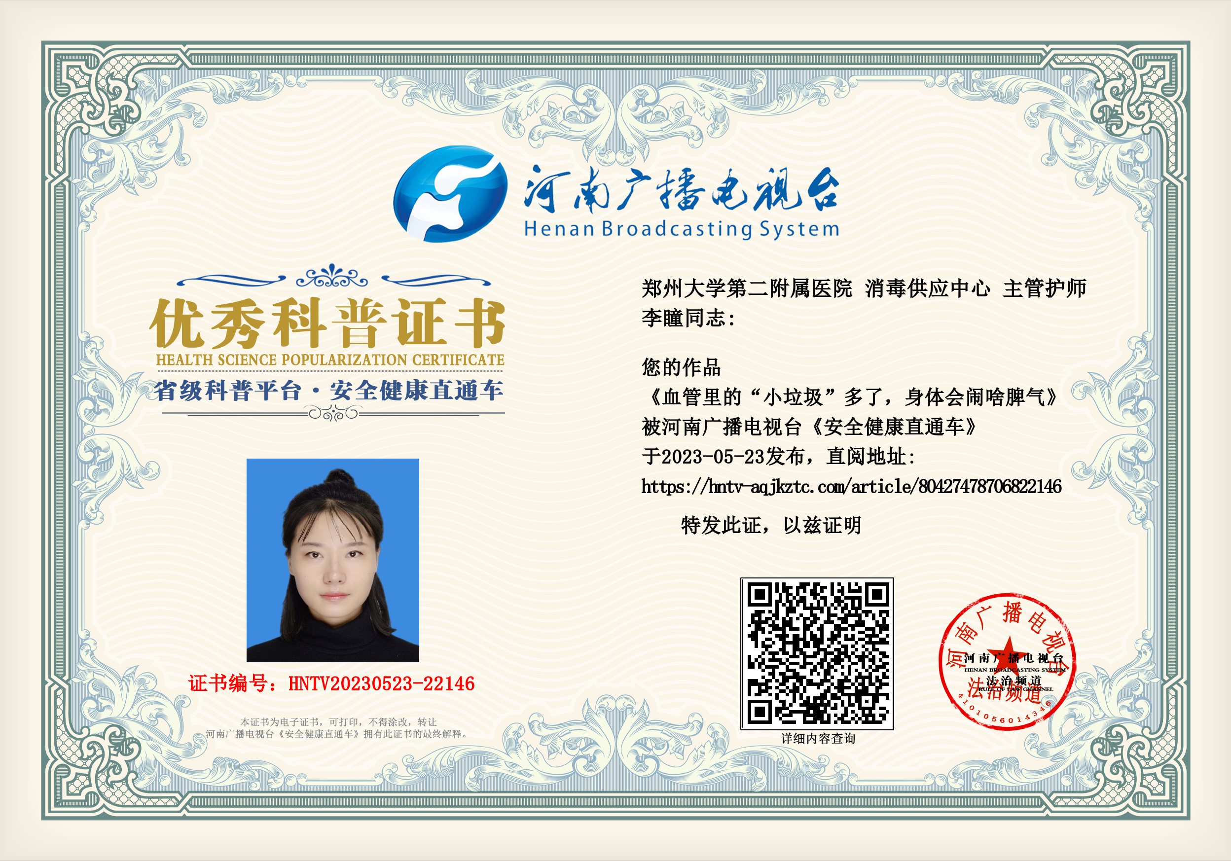 (李瞳 郑州大学第二附属医院 消毒供应中心 主管护师)