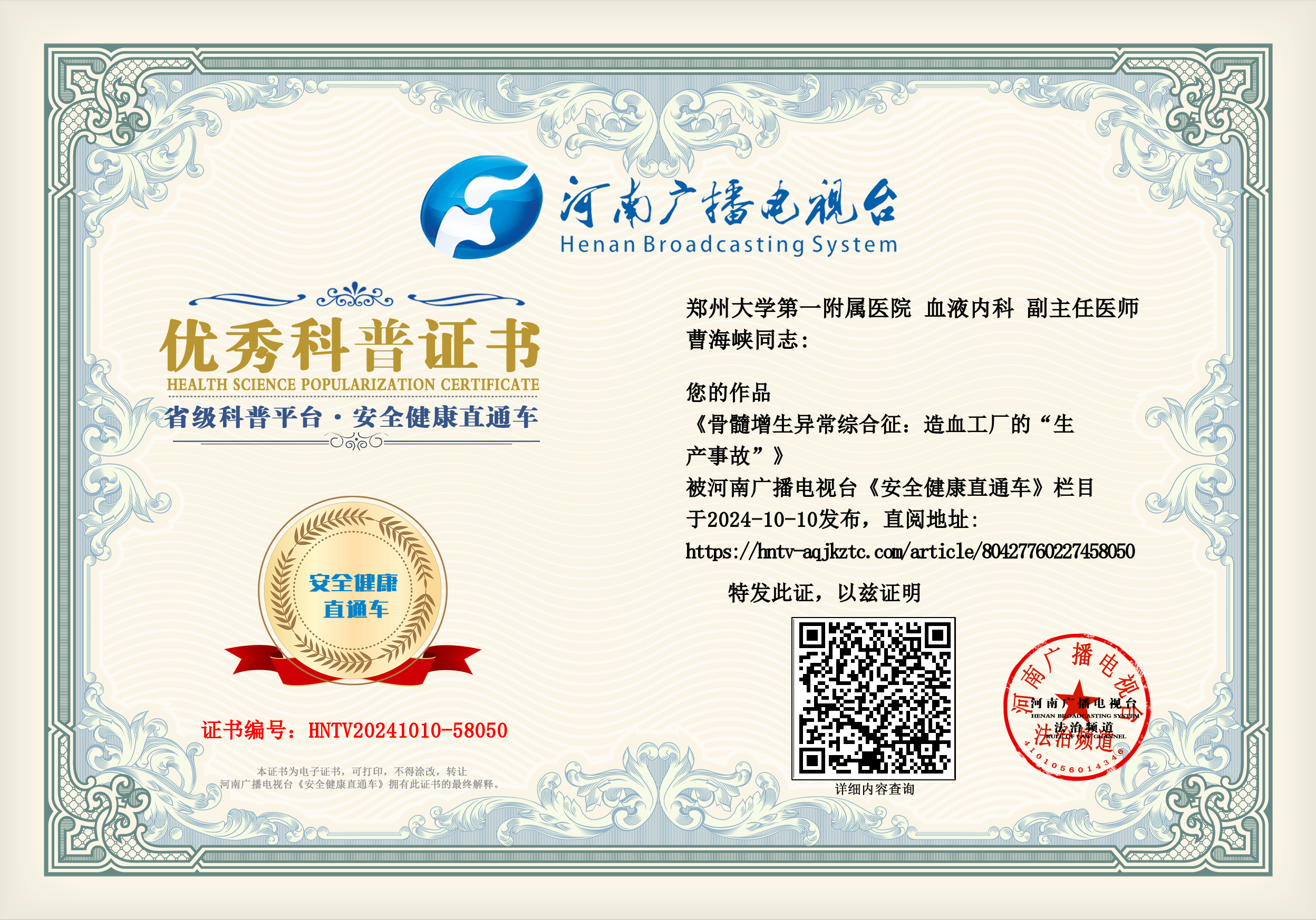 (曹海峡 郑州大学第一附属医院 血液内科 副主任医师)