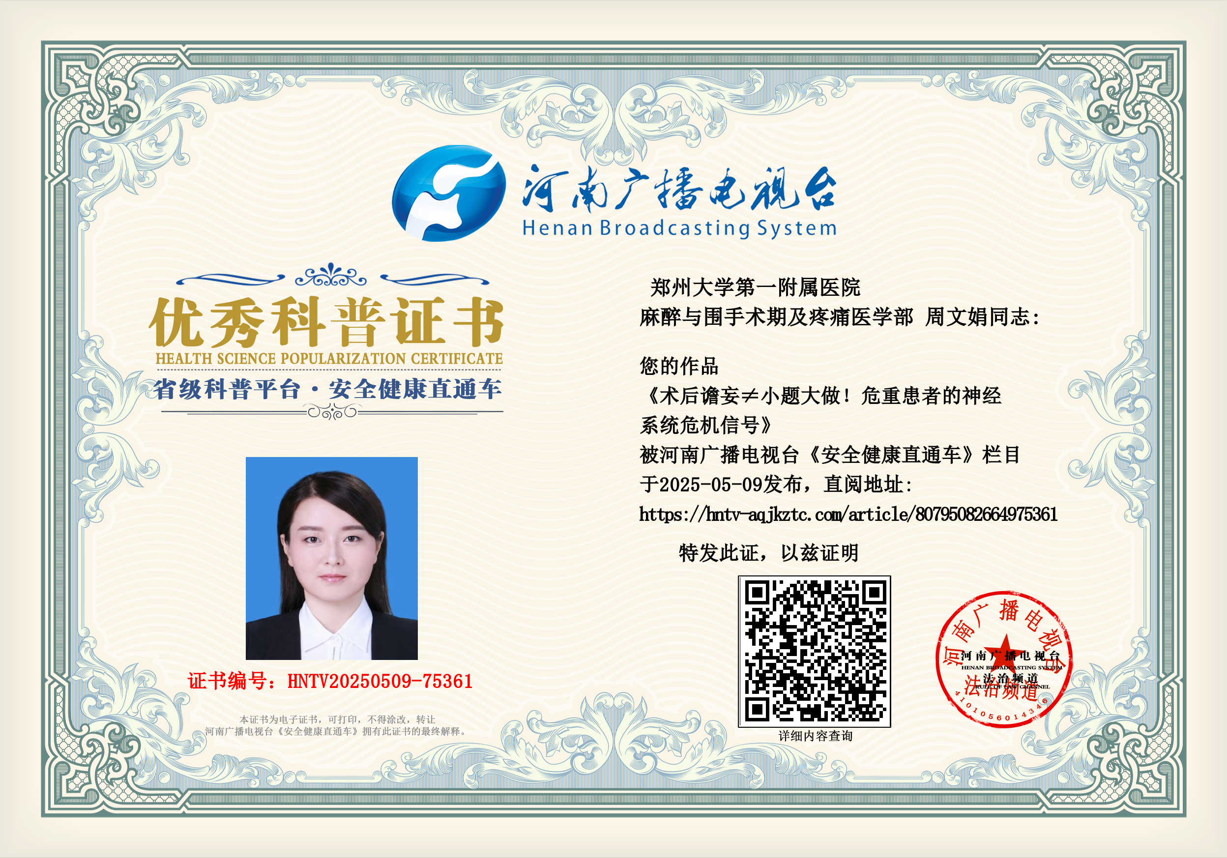 (周文娟 郑州大学第一附属医院 麻醉与围手术期及疼痛医学部)