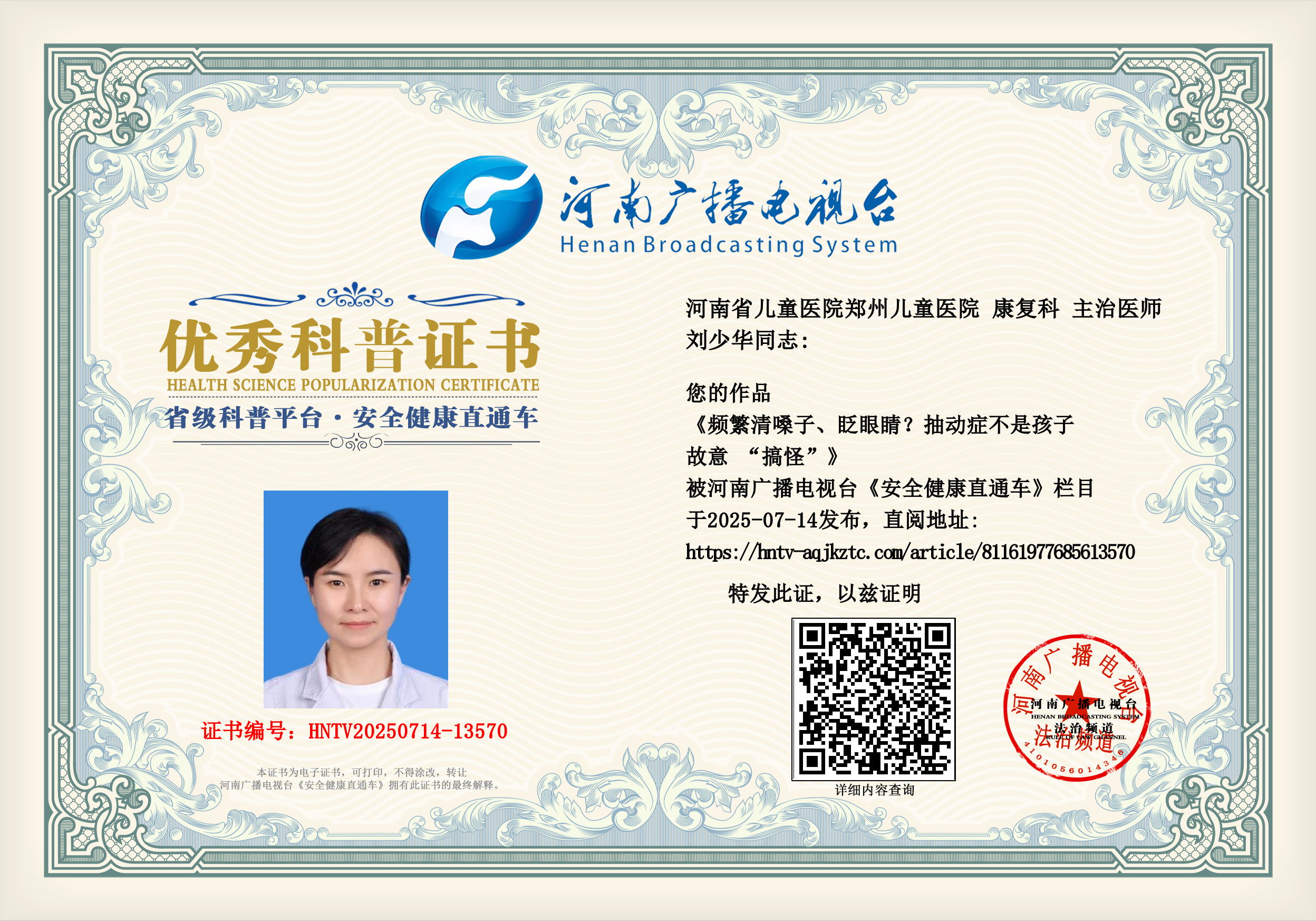 (刘少华 河南省儿童医院郑州儿童医院 康复科 主治医师)
