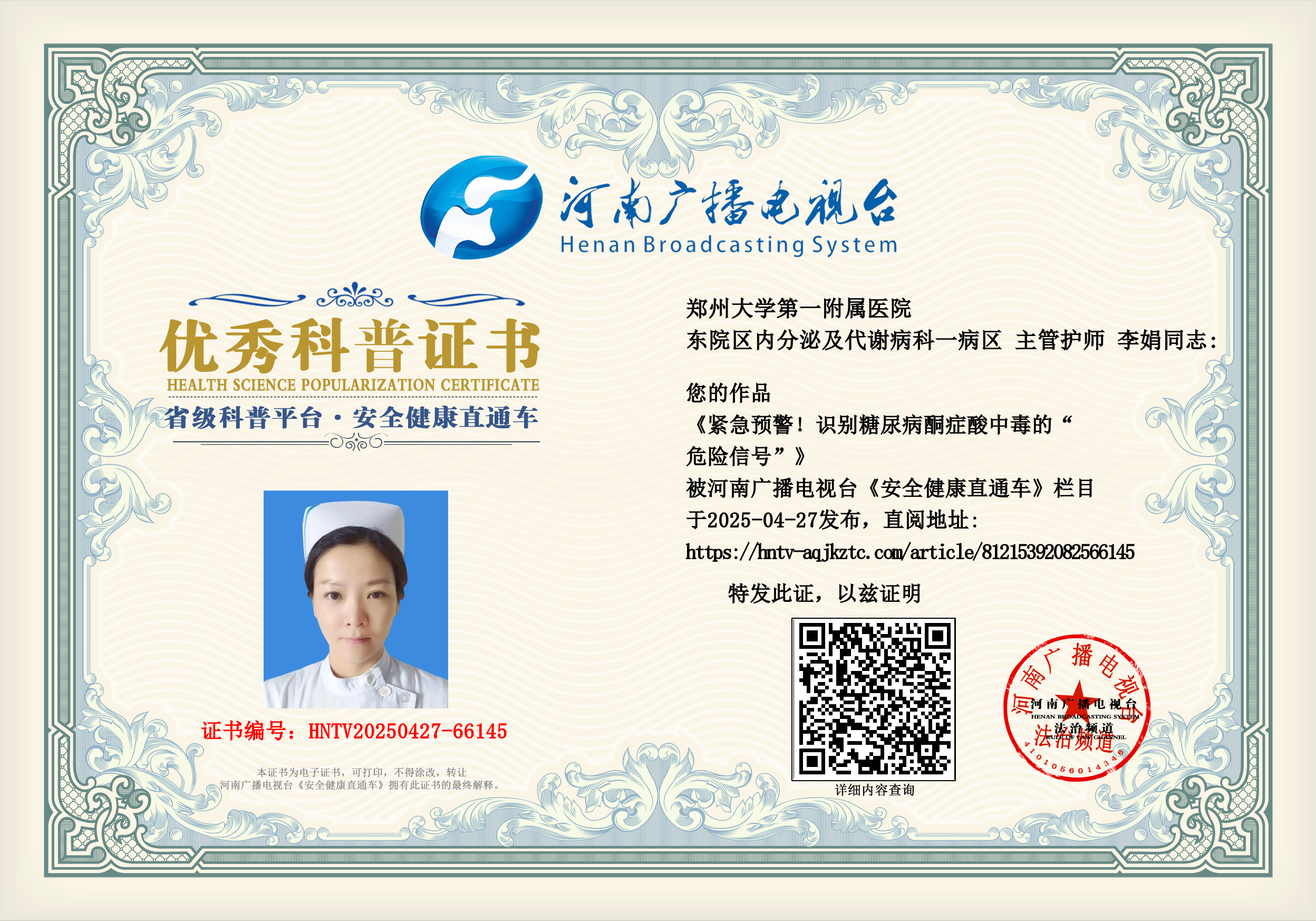 (李娟 郑州大学第一附属医院 东院区内分泌及代谢病科一病区 主管护师)