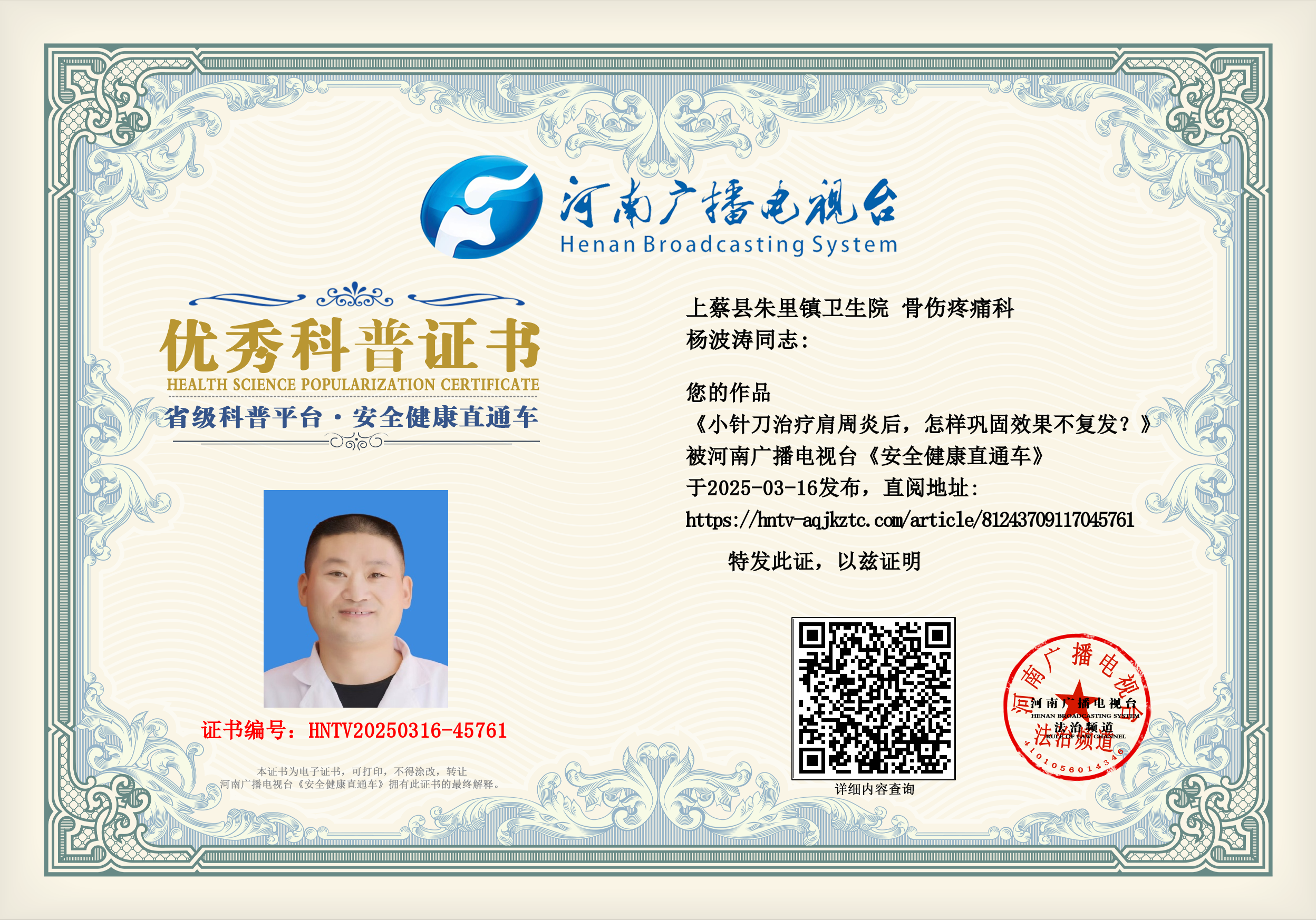 (杨波涛 上蔡县朱里镇卫生院 骨伤疼痛科)
