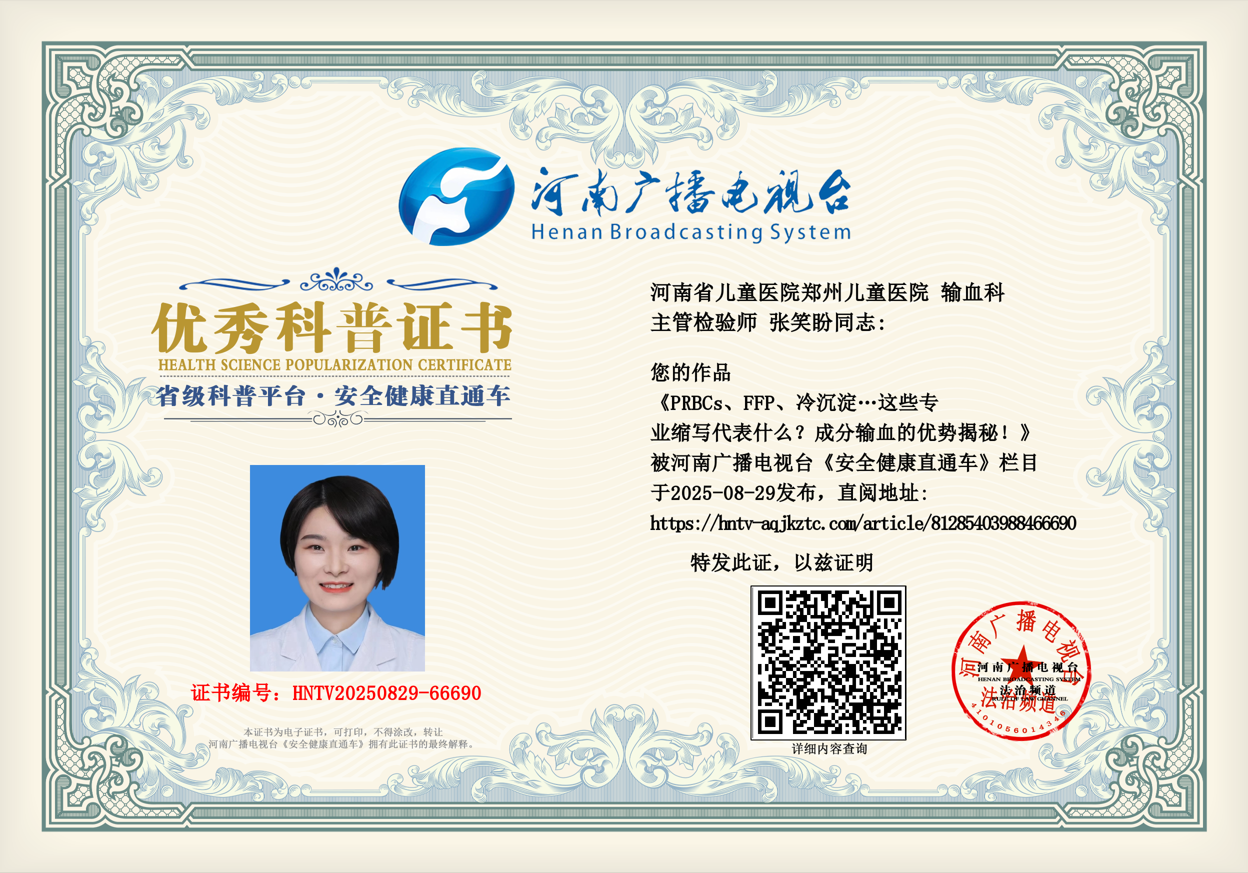 (张笑盼 河南省儿童医院郑州儿童医院 输血科 主管检验师)