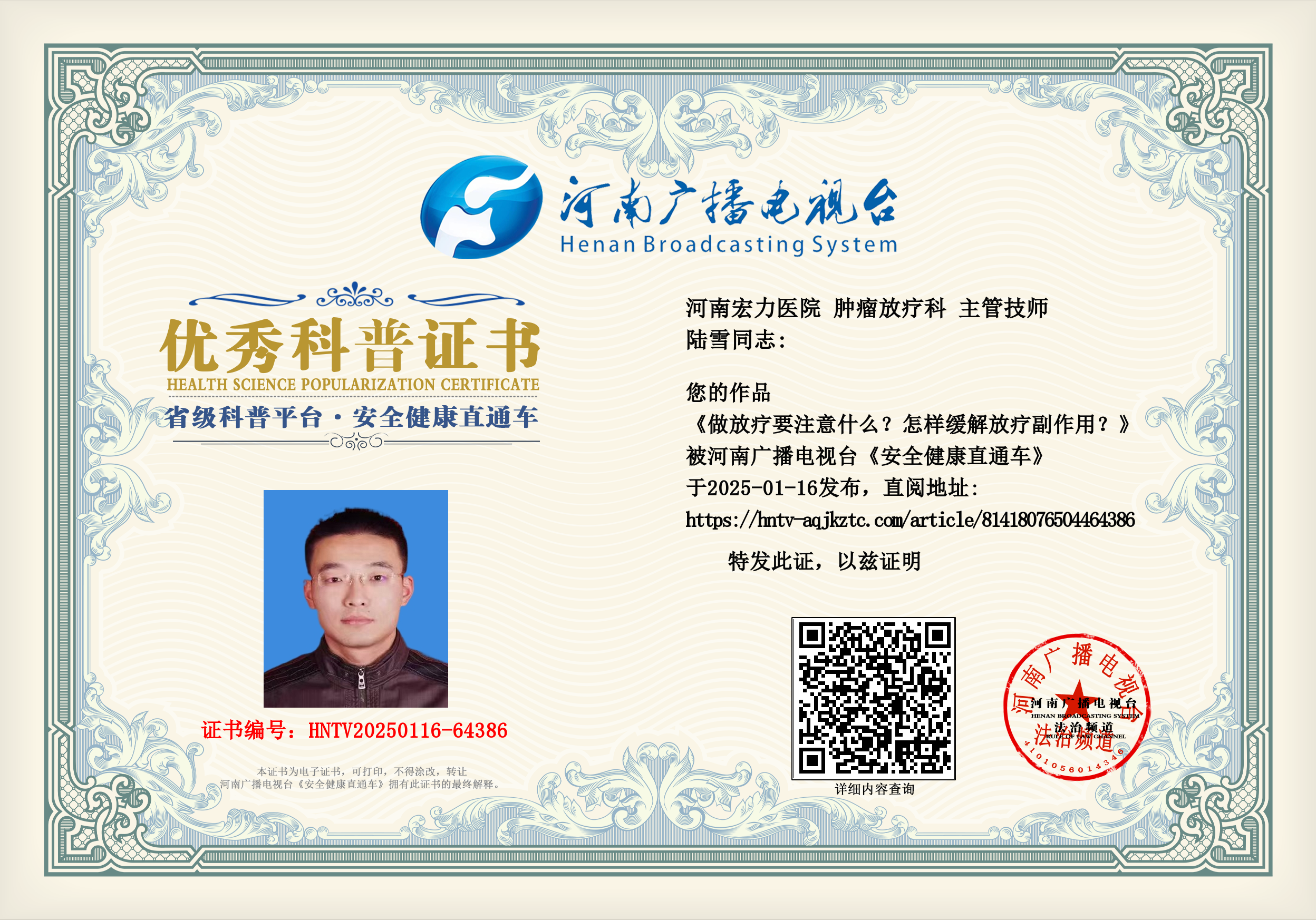 (陆雪 河南宏力医院 肿瘤放疗科 主管技师)