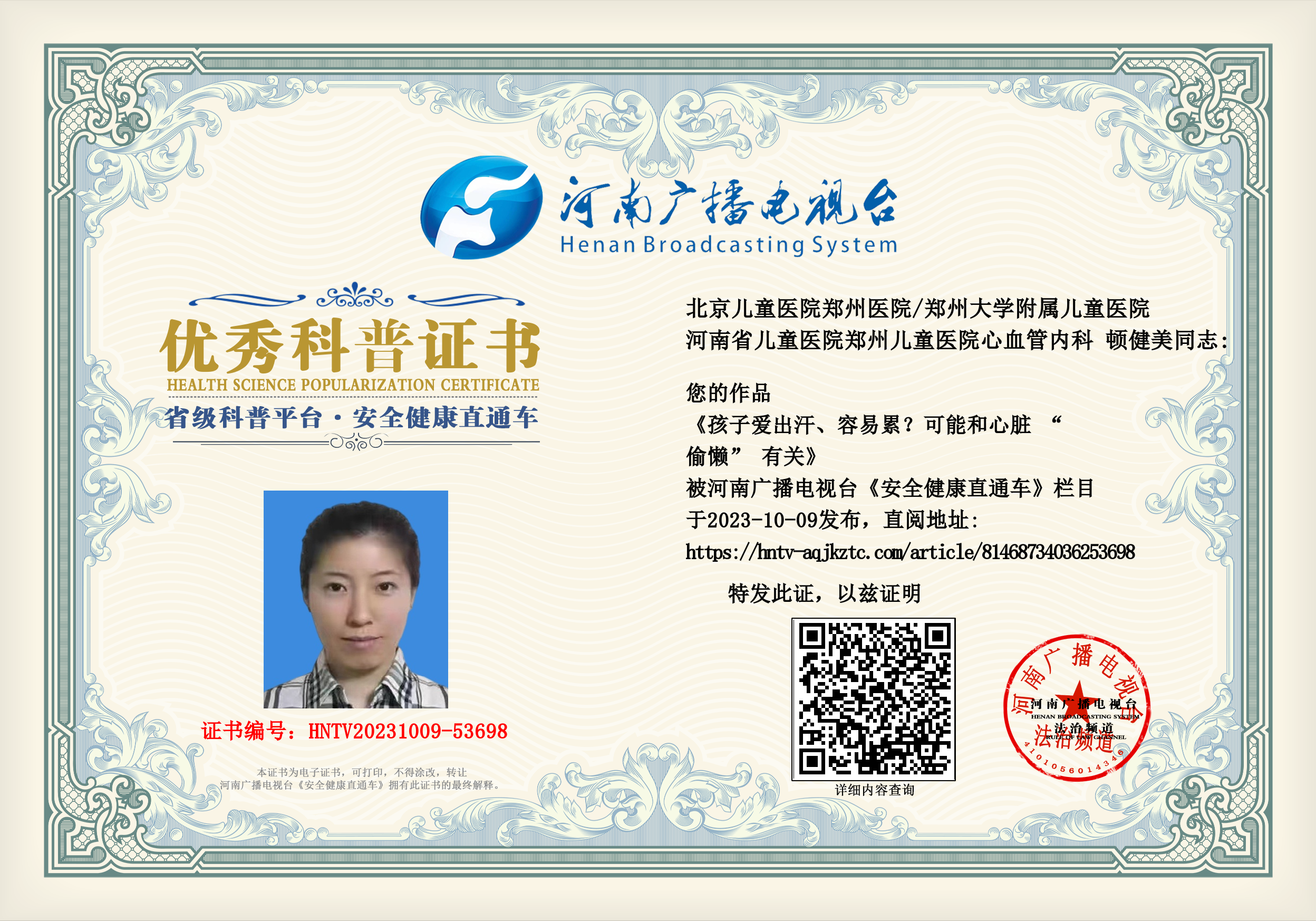 (顿健美 北京儿童医院郑州医院/郑州大学附属儿童医院 河南省儿童医院郑州儿童医院心血管内科 主管护师)