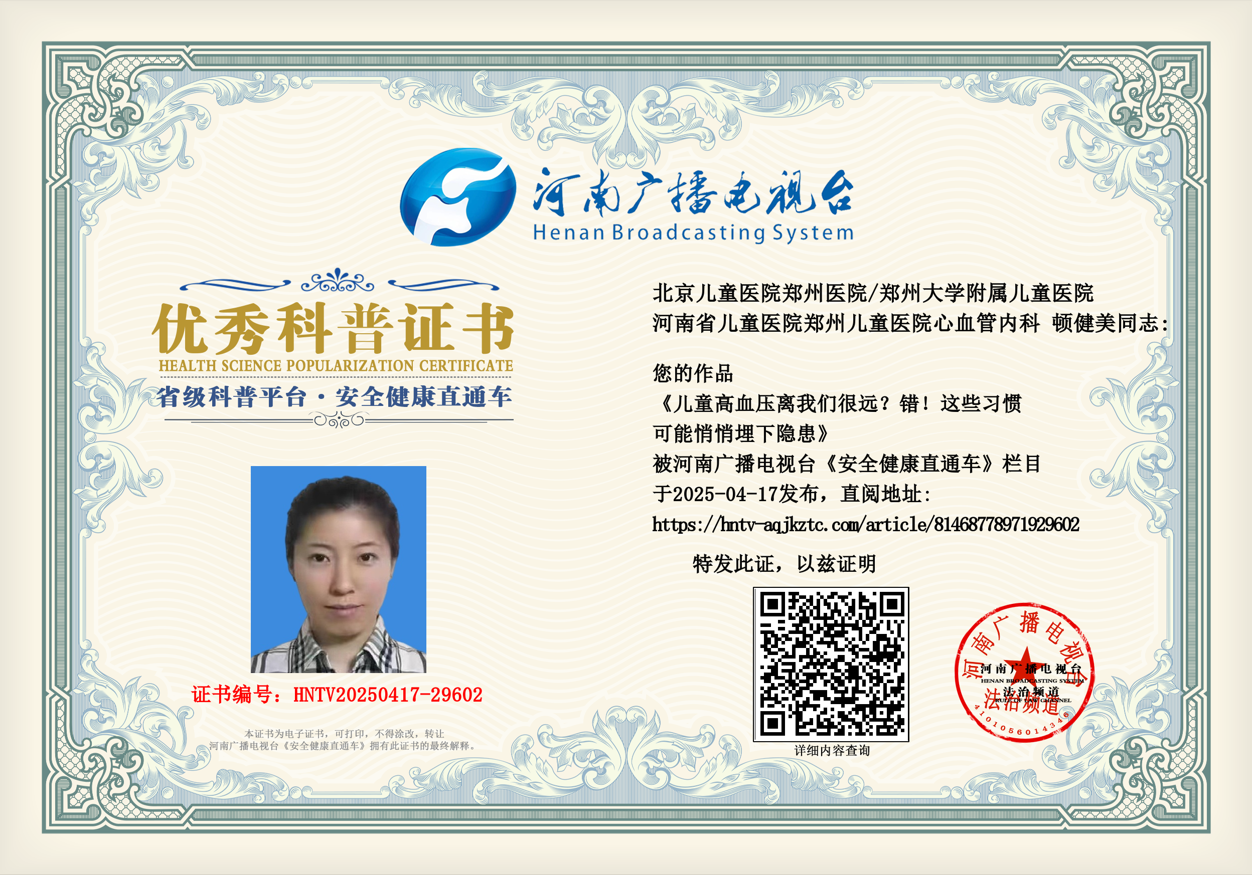(顿健美 北京儿童医院郑州医院/郑州大学附属儿童医院 河南省儿童医院郑州儿童医院心血管内科 主管护师)