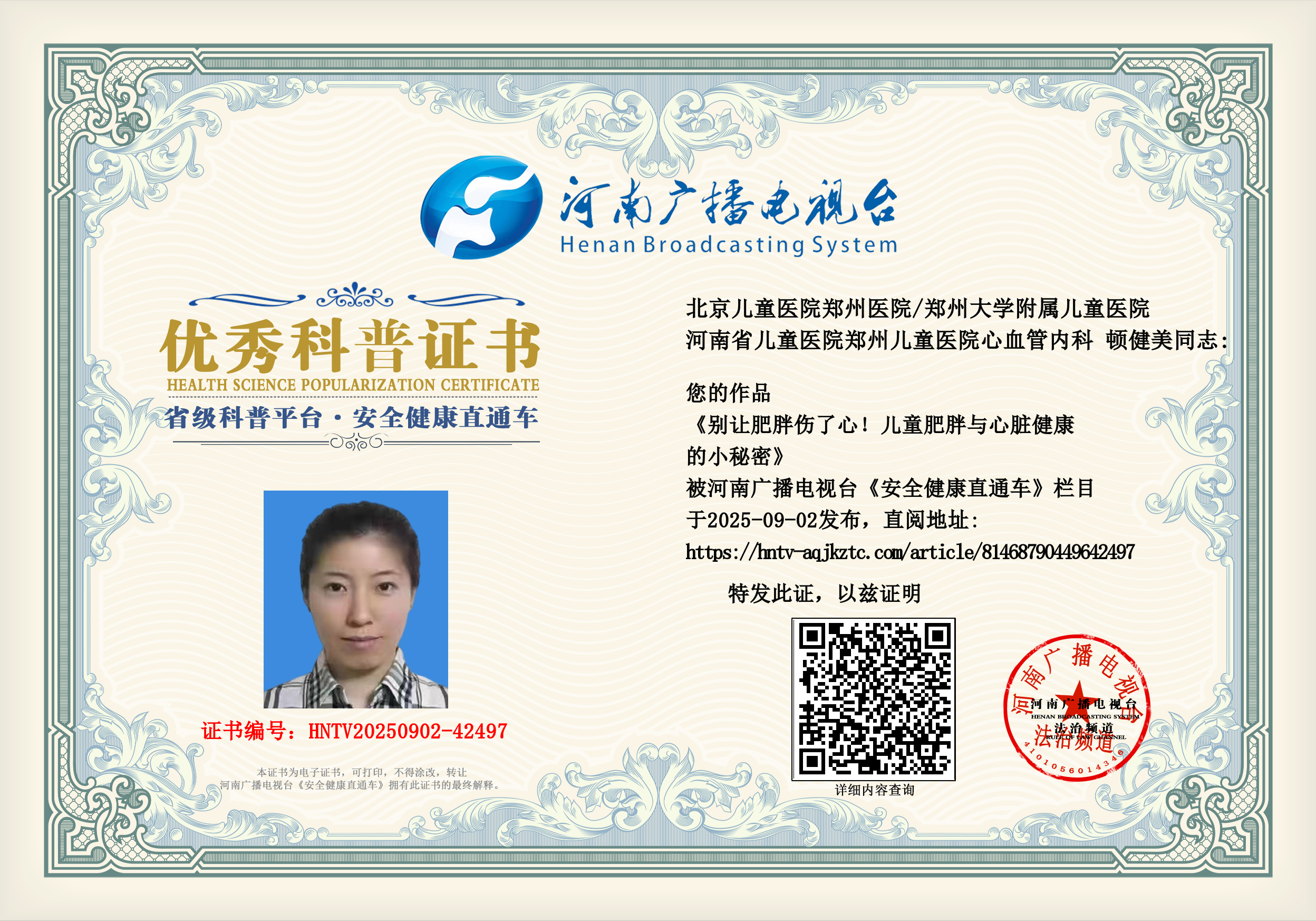 (顿健美 北京儿童医院郑州医院/郑州大学附属儿童医院 河南省儿童医院郑州儿童医院心血管内科 主管护师)