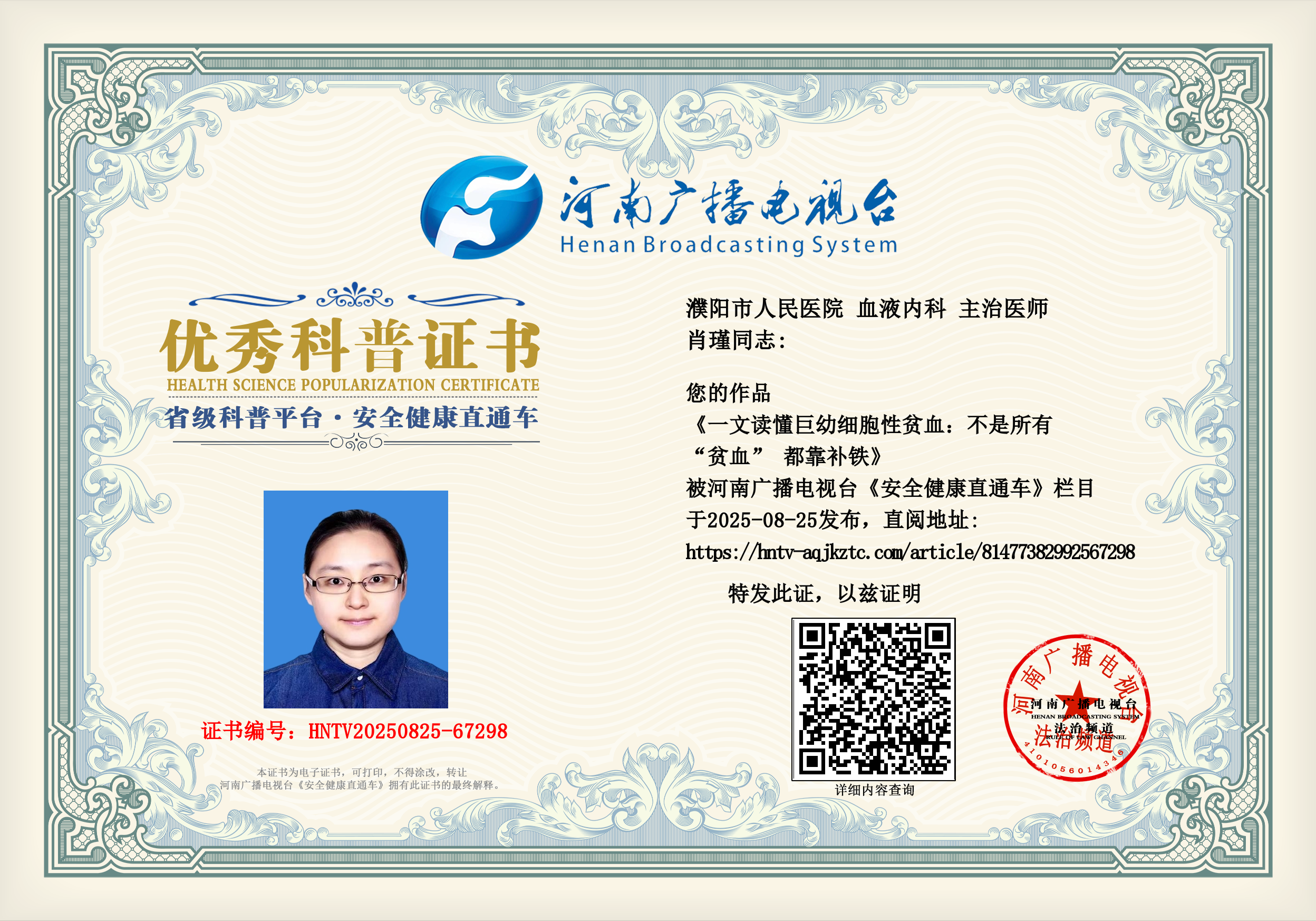 (肖瑾 濮阳市人民医院 血液内科 主治医师)
