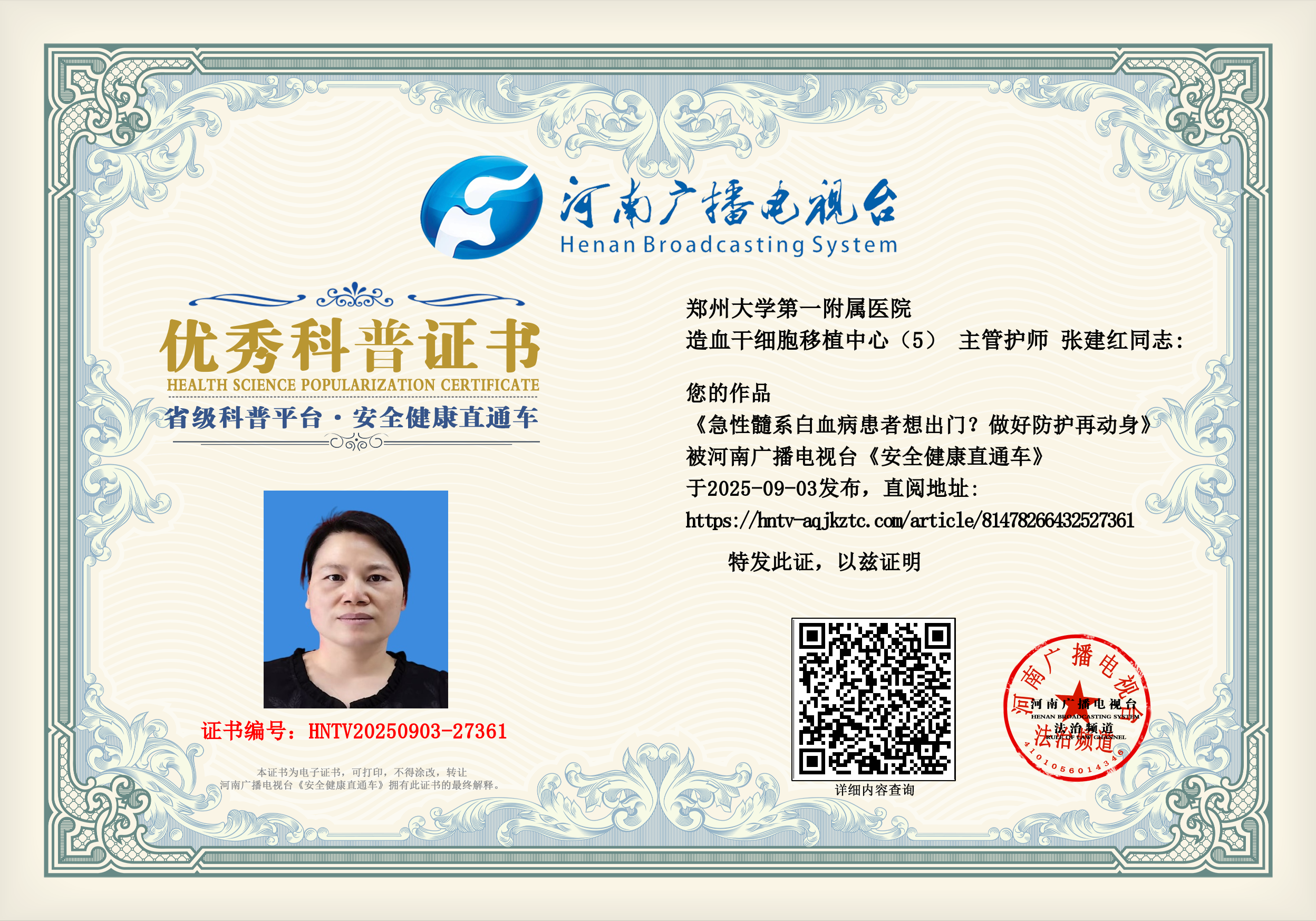 (张建红 郑州大学第一附属医院 造血干细胞移植中心(5) 主管护师)