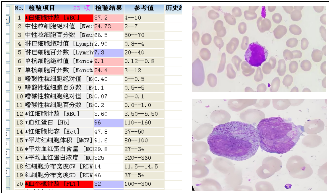 患者男性,46岁,以“消化道出血”收入院,入院后常规检查。血常规提示:白细胞37.2×109/L,HGB96g/L,PLT