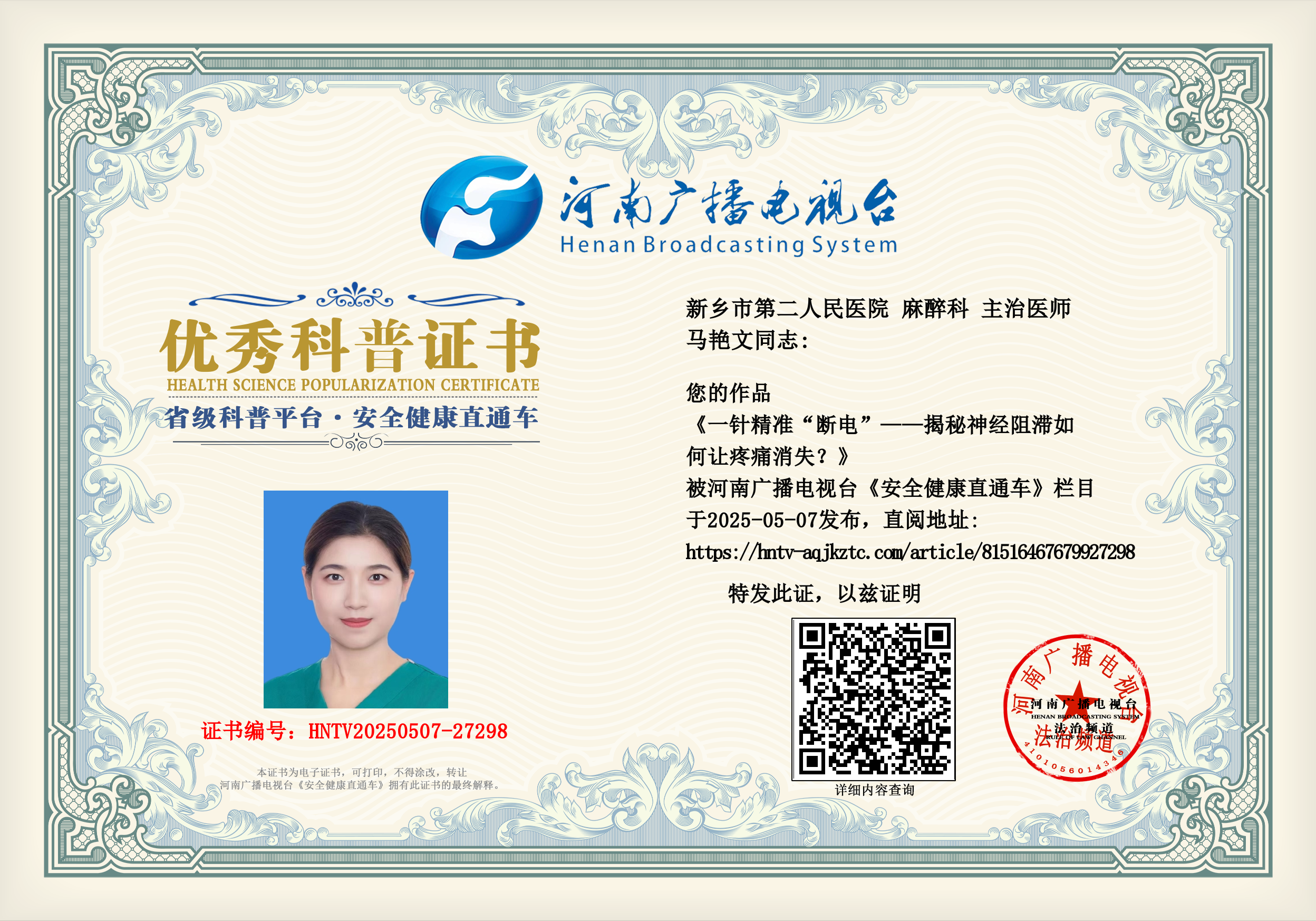 (马艳文 新乡市第二人民医院 麻醉科 主治医师)