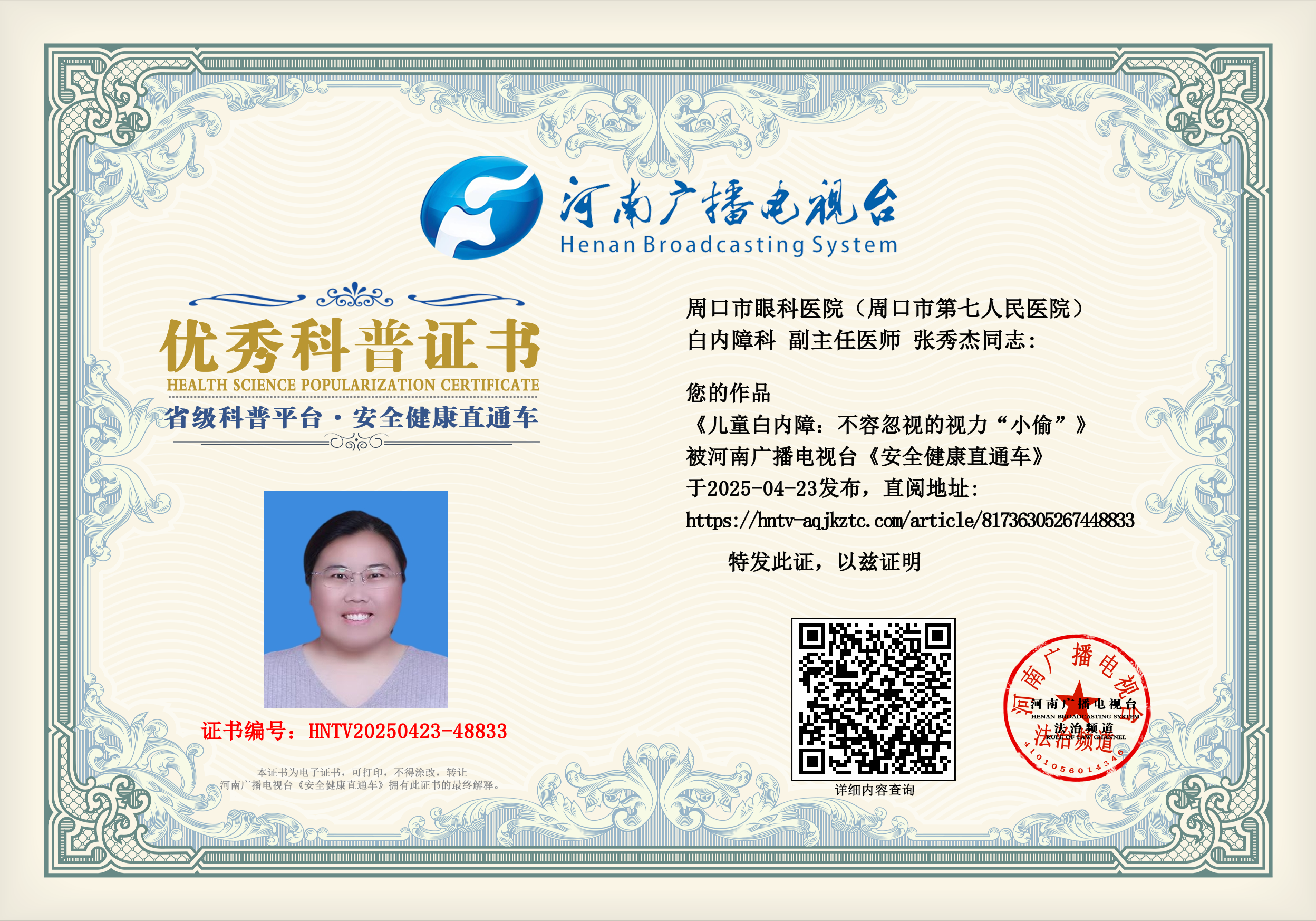 (张秀杰 周口市眼科医院(周口市第七人民医院) 白内障科 副主任医师)