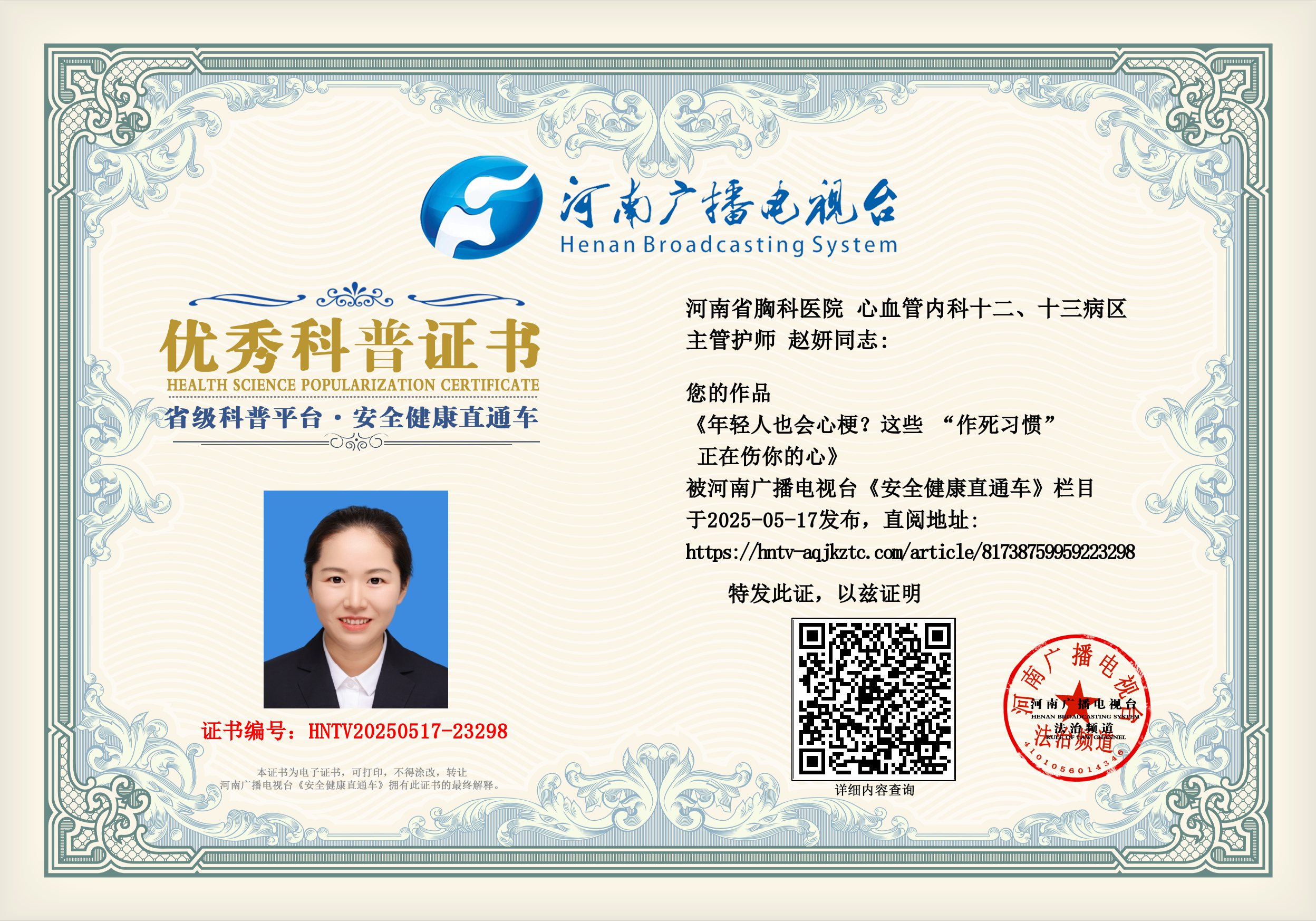 (赵妍 河南省胸科医院 心血管内科十二、十三病区 主管护师)
