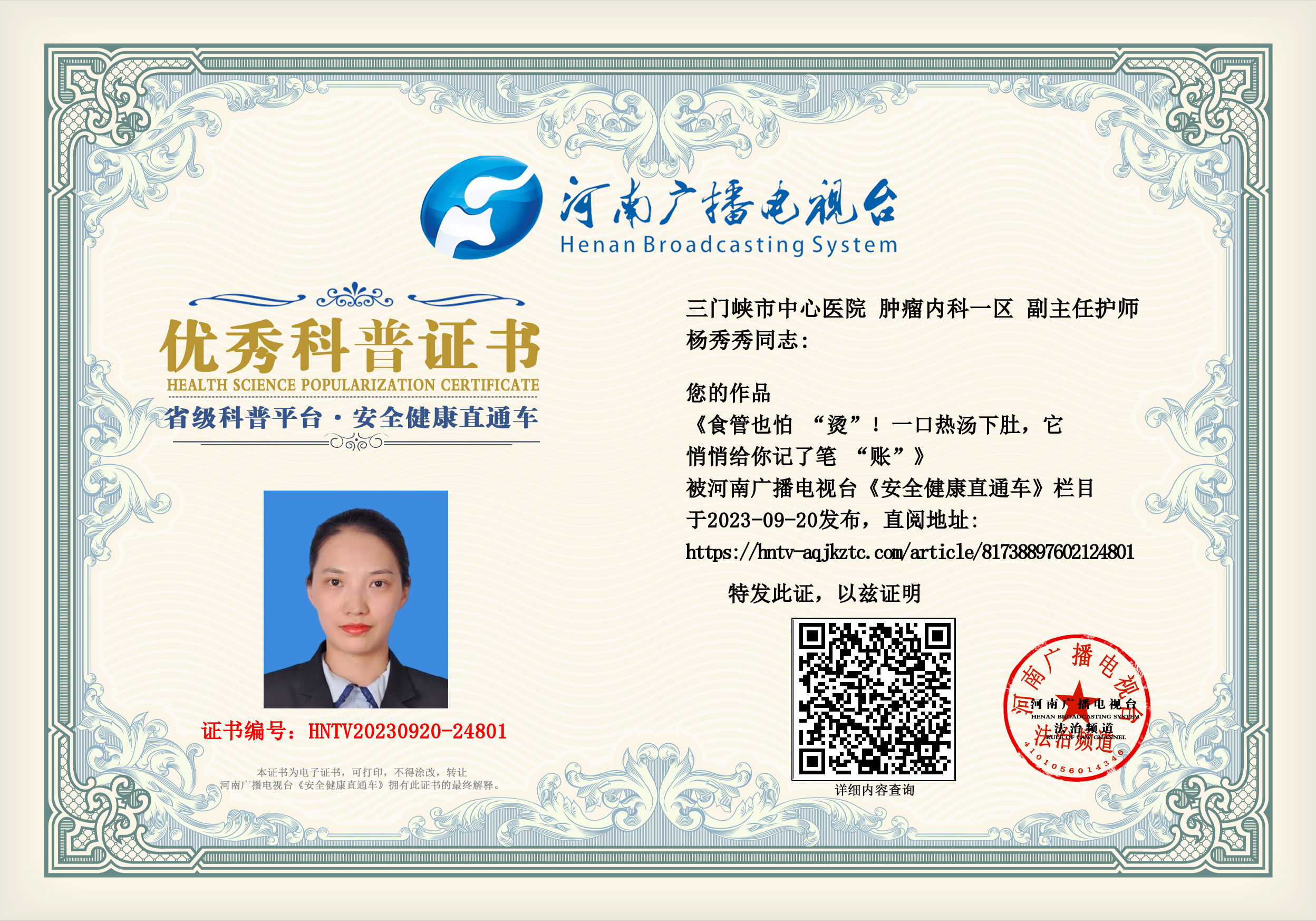 (杨秀秀 三门峡市中心医院 肿瘤内科一区 副主任护师)