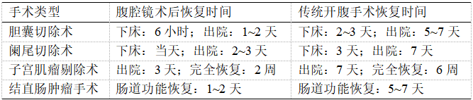 传统开腹手术后,患者需卧床5~7天,住院7~10天;而腹腔镜术后1~2天即可下床活动,3-5天可出院。例如: