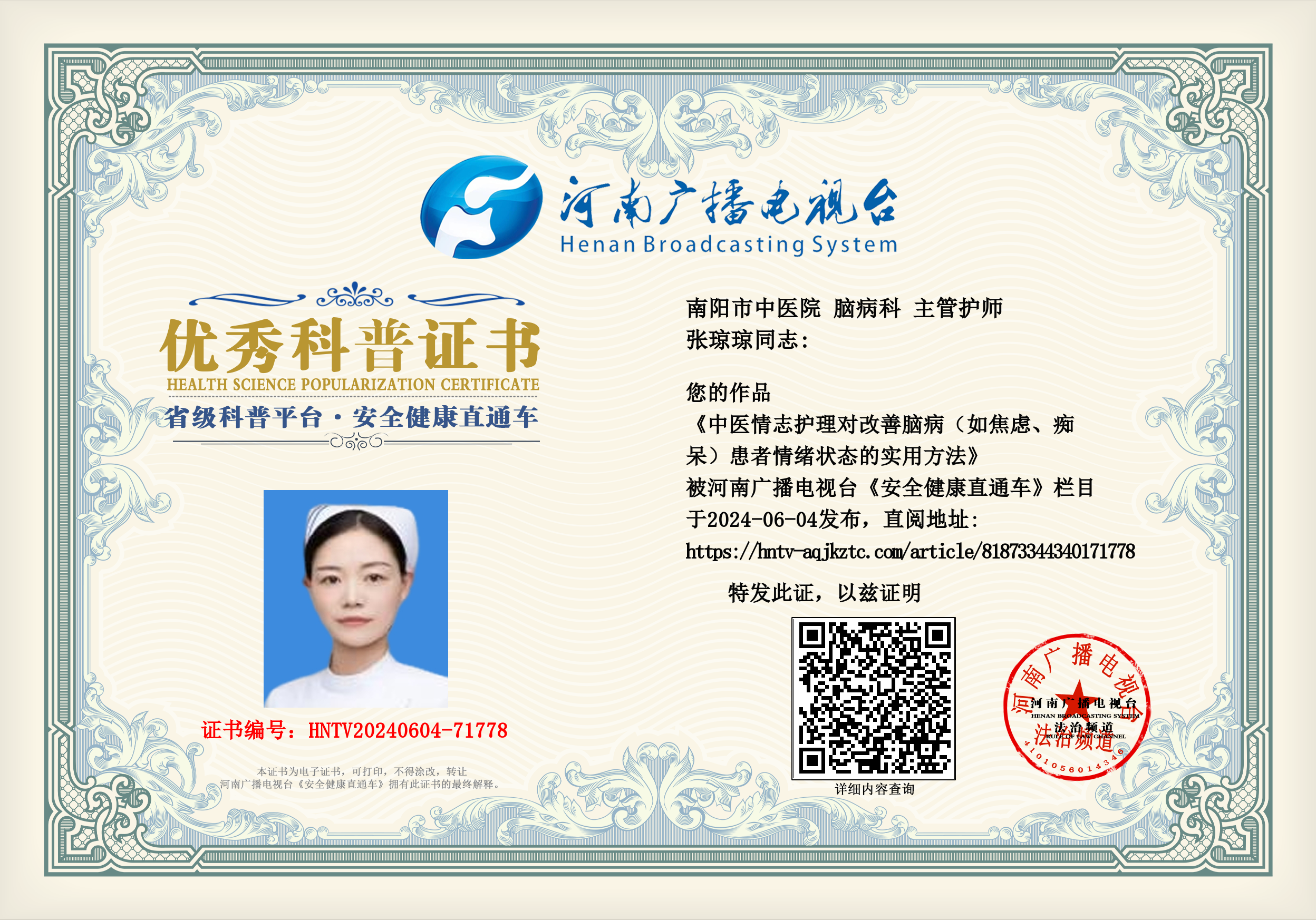 (张琼琼 南阳市中医院 脑病科 主管护师)